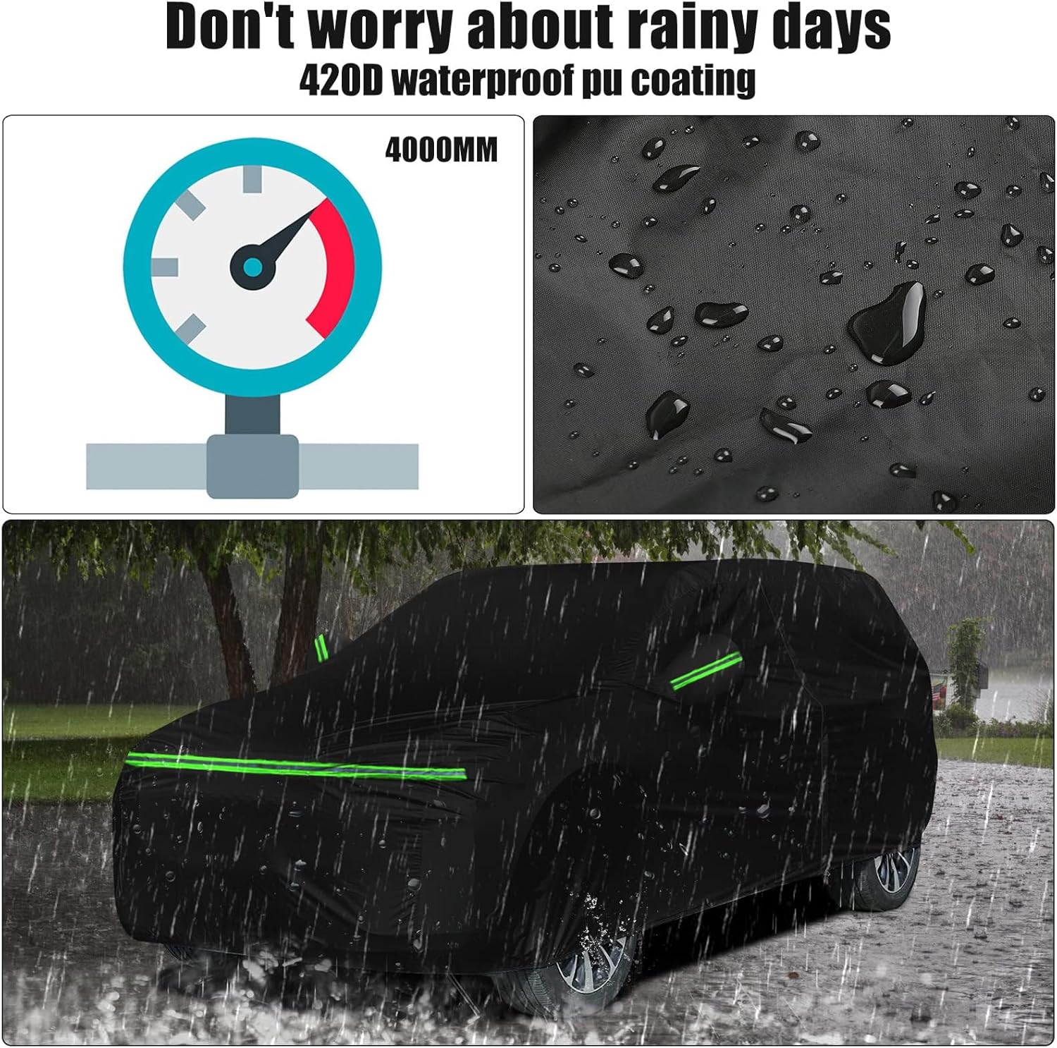 - 3 Windproof Details: windproof buckle, windproof strips and elastic belt on the tail edge, so that your car cover will not be blown away even in the face of strong wind, which is very good to protect your car
