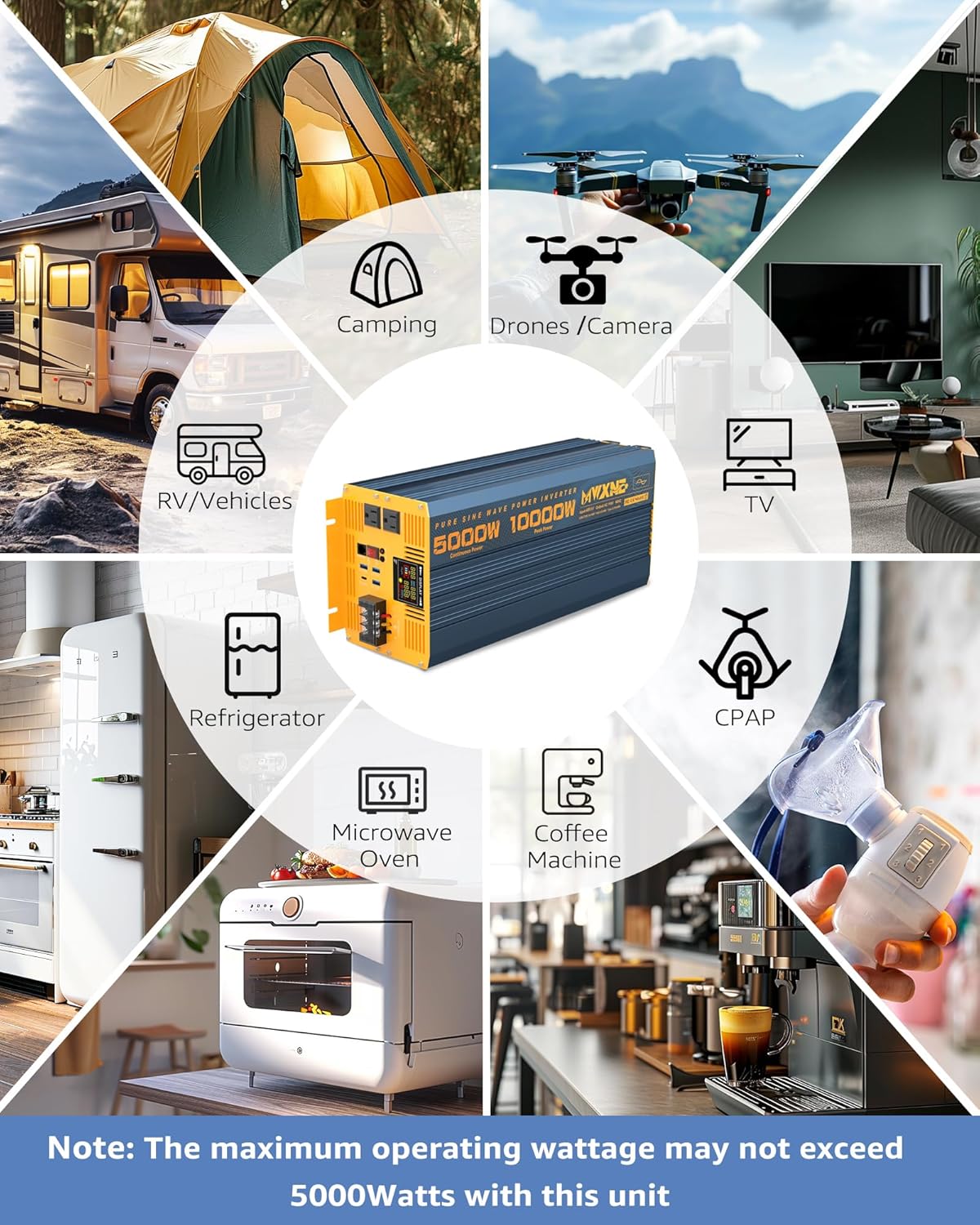 - ăFAST CHARGING USB PORTSăMWXNE Upgrade fully 5000 Watt Power Inverter converts 48V DC to 110V 120V AC with 2 AC outlets, 2 18W USB-A ports,a 24W USB-A port and 60W USB-CïŒTYPE-CïŒ PD port for fast charging. 4 USB ports can power multiple devices at the same time.It is convenient for you to use in various environments and share with your family and friends.