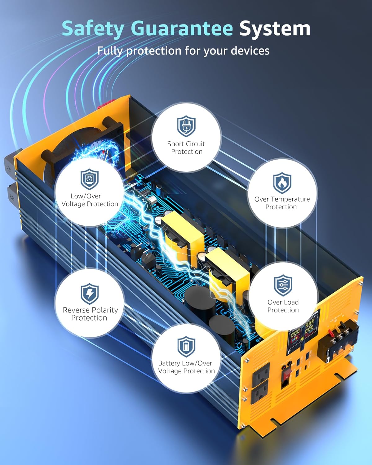 - 【FULLY SAFETY PROTECTIONS】 Pure sine wave inverter has passed FCC CE ROHS PSE certification. Designed with isolated input/output stable design offers under-voltage protection, overvoltage protection, overload protection, overheating protection, and short circuit protection to ensure safety.