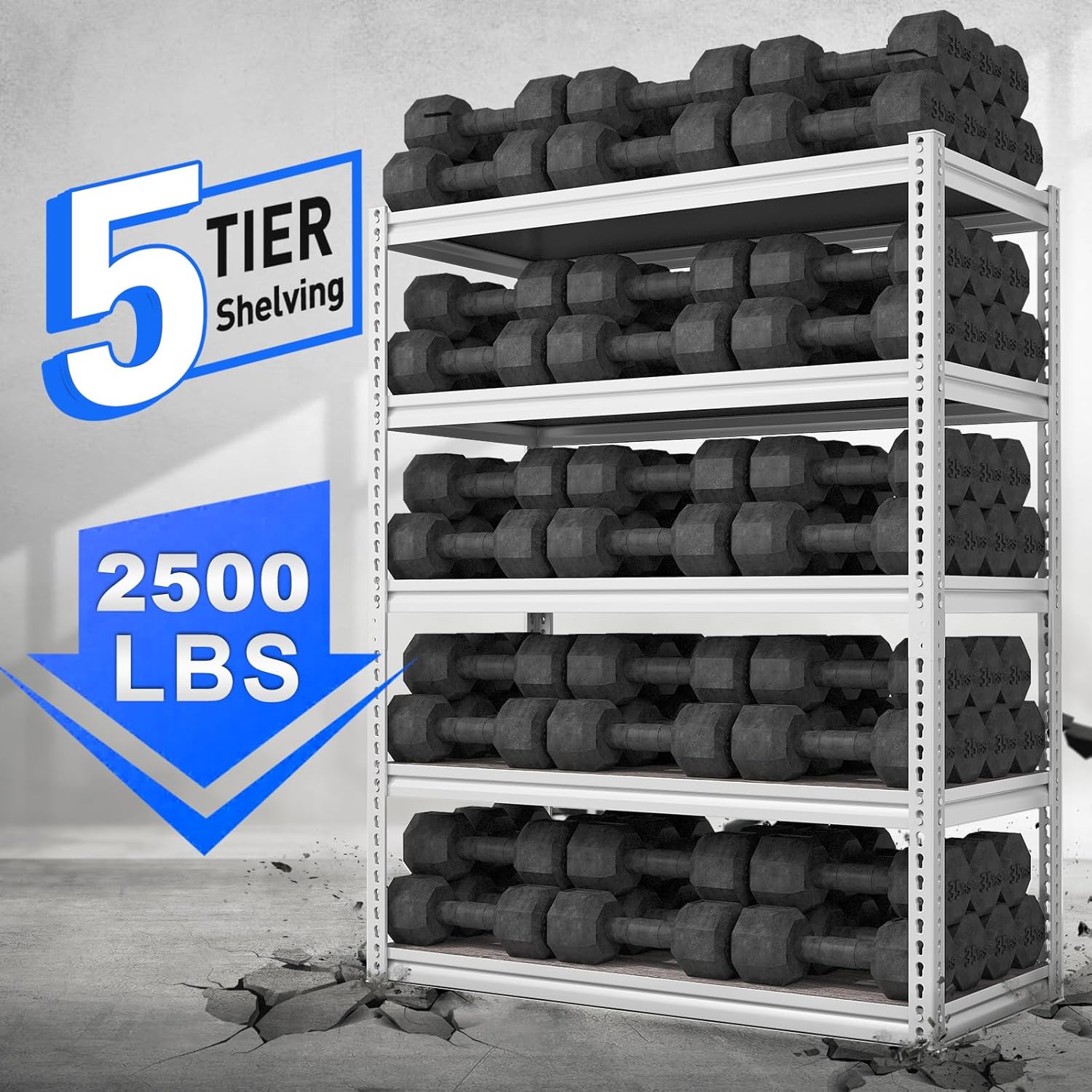 - ă2500LBS Capacity Garage Storage Shelves Heavy DutyăThis garage shelving is made of high intense premium metal and thick overlaid laminate boards(E1 Grade, 0.35"), of which maximum load is 500 lbs per shelf (equal distribution). With a total bearing capacity of 2500 lbs, which makes 5 tier heavy duty shelving more stable and stores more stuff