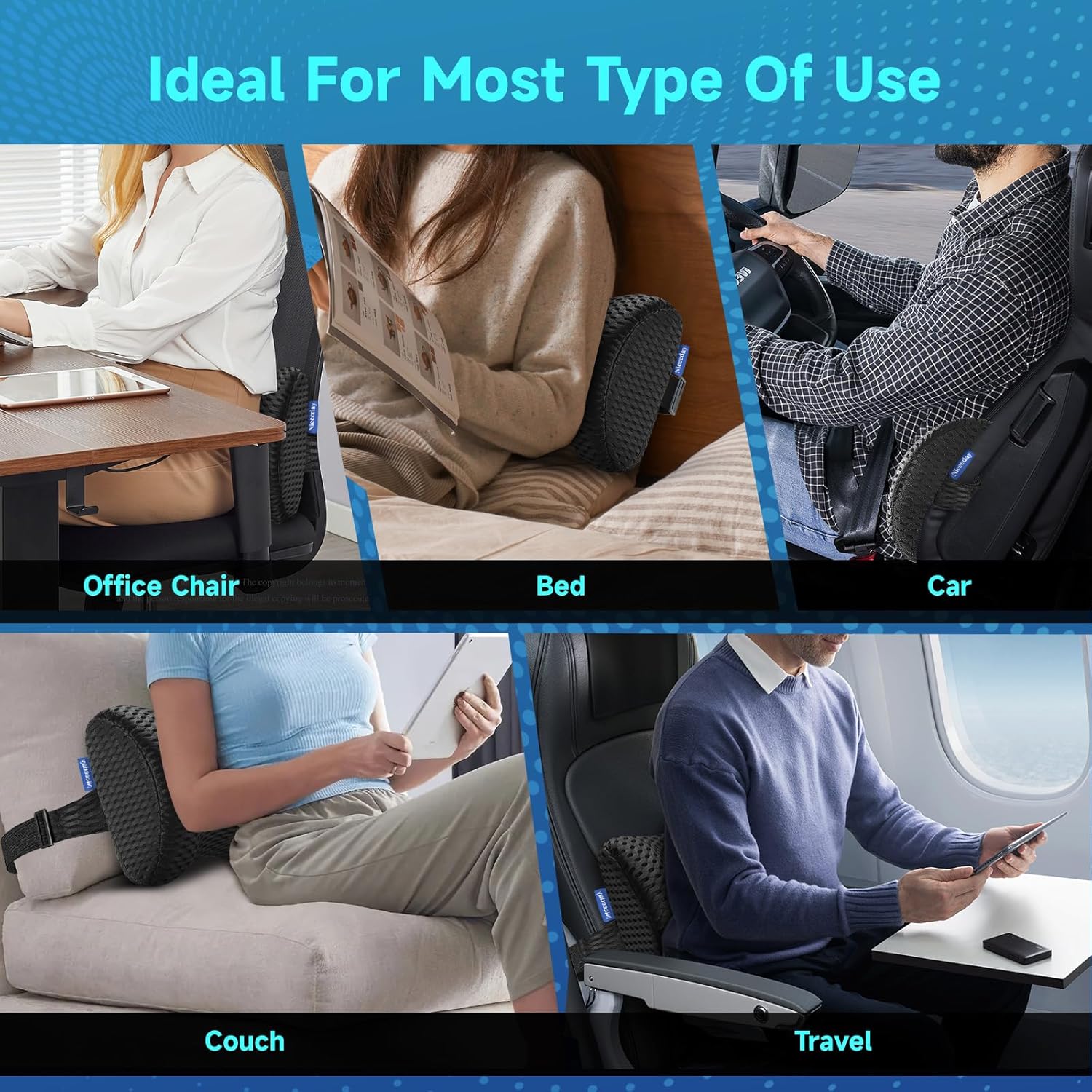 - 【Memory foam Support for Back and Lumbar & Suitable for All People】Memory foam backrest with soft fabric backing keeps shape and can be reused. Comes the elasticity, which makes our product support your back in a proper posture. Unlike other lumbar support pillow, our product with designed curve and waist embracing design, hold your back all the time. Suitable size for office workers, pregnant, drivers and students to improve their posture