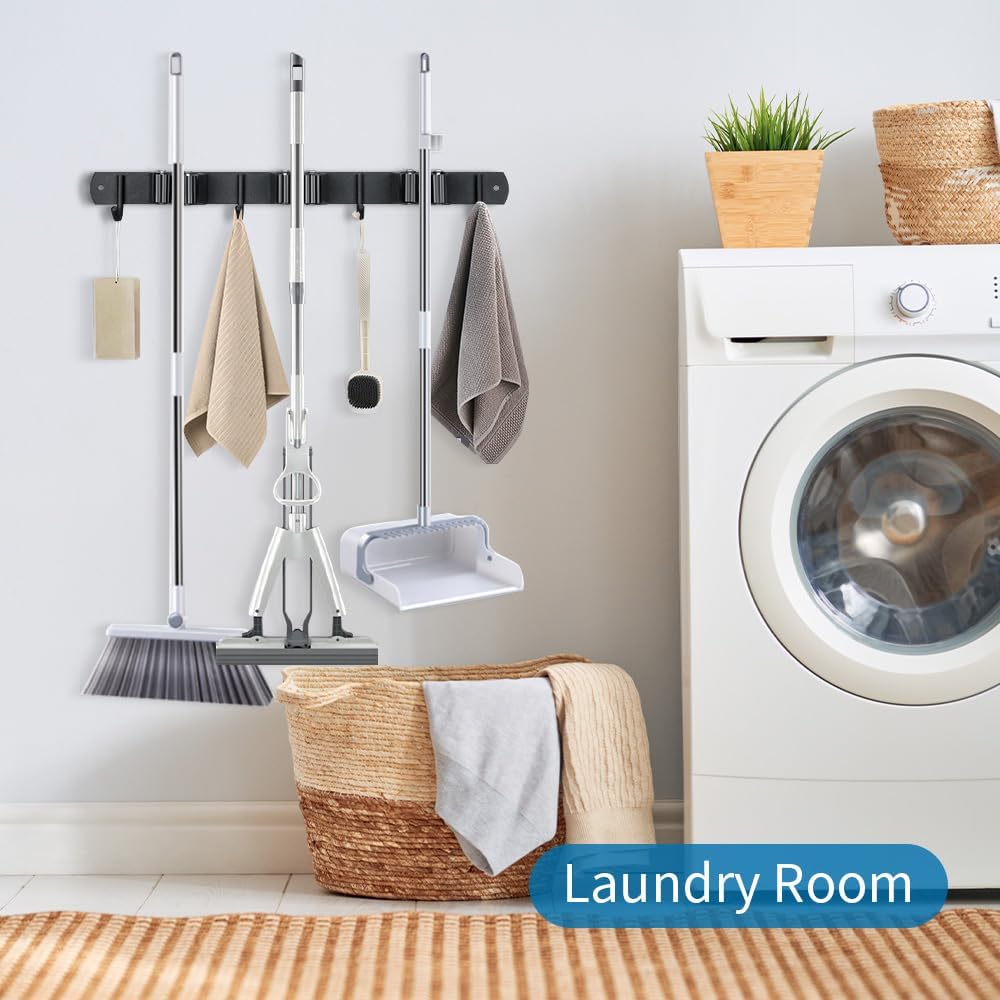 - 🏠【HIGH CAPACITY】: Each broom organizer wall mount has 3 rubber roller clips and 4 hooks, there are total 7 positions for mops, brooms, duster, shovels etc. Push them into the clamps with easy after finish your household cleaning. It can help you utilize your space to the maximized extent and make itmuch easier to store and take objects.