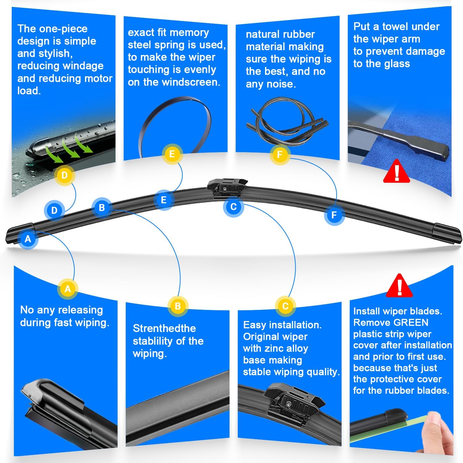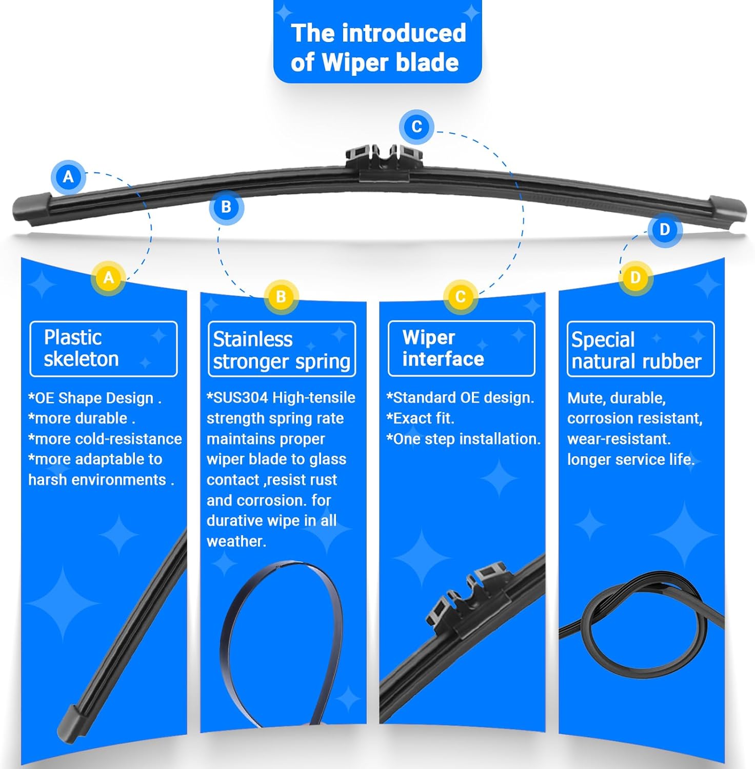 - {WIPER PERFORMANCE}: Natural rubber material making sure the wiping is the best, quiet wiping without judder or squeaking, resistant and a long service life.
