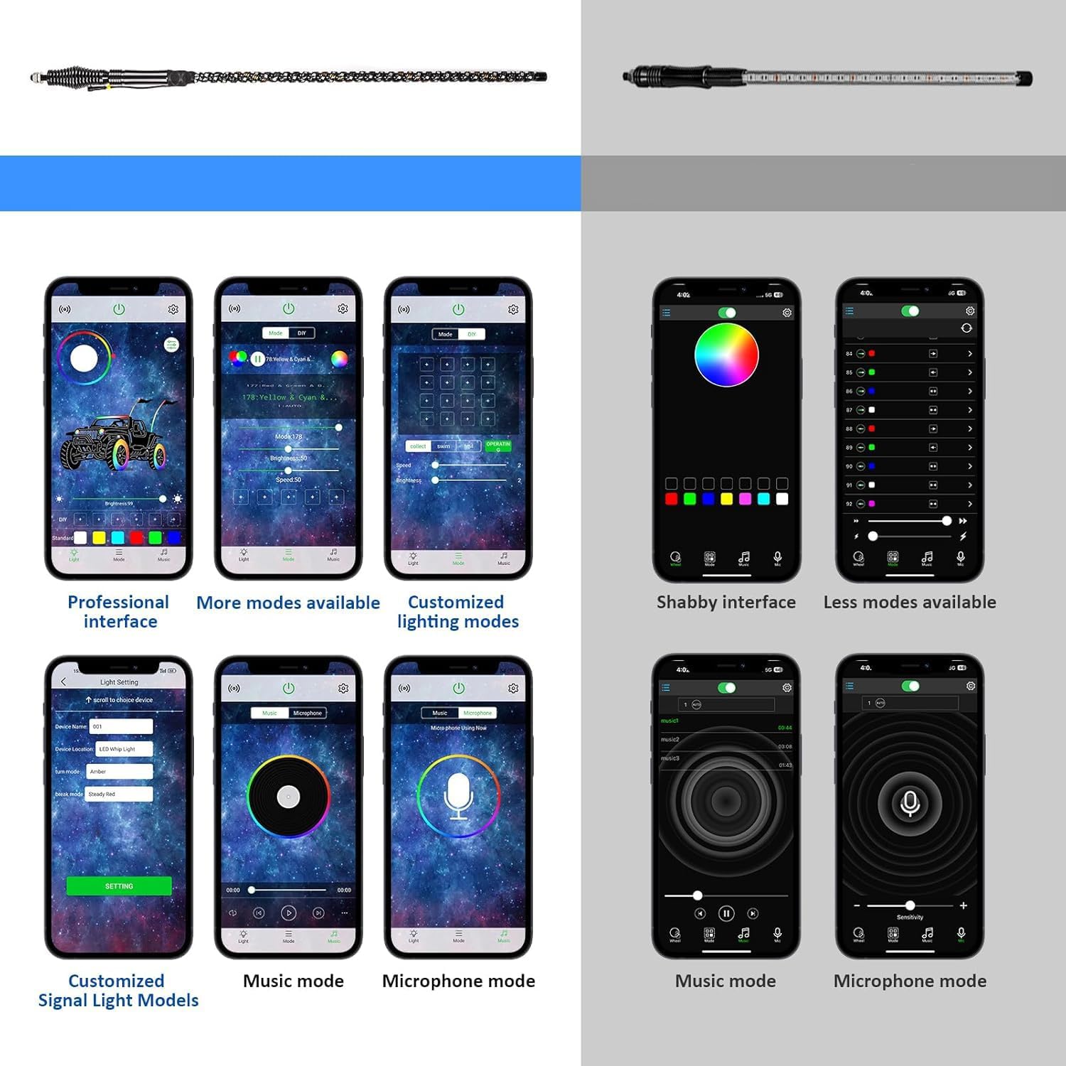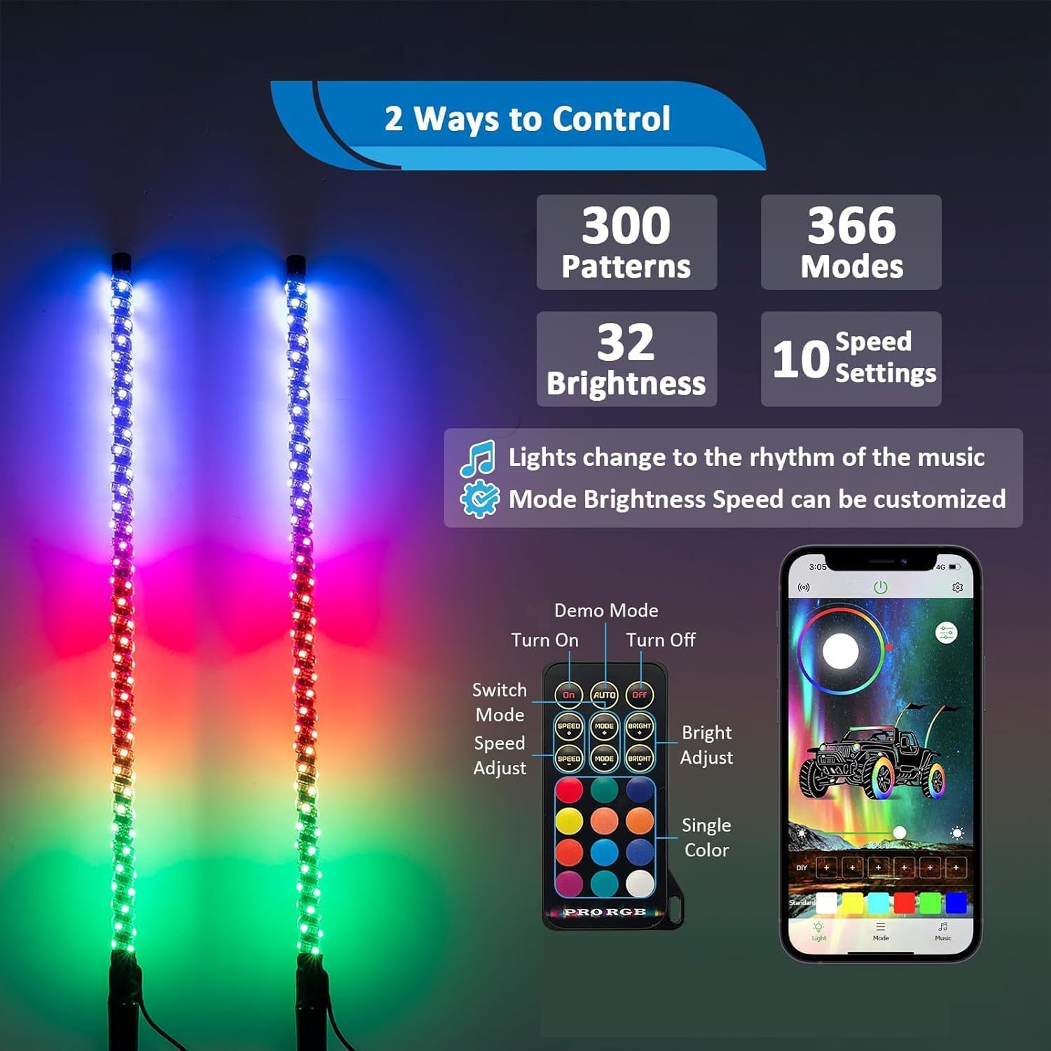 - [Customizable Colors & Modes] - The integrated RGB lighting configurations allow for a wide variety of lighting changes to meet your ambiance needs of different moods on any occasion. With 300 patterns, 366 modes, 32 brightness, and 10-speed settings, you can easily customize this whip light with your favorite patterns like chasing, build-up, strobe, flash, blink, etc.