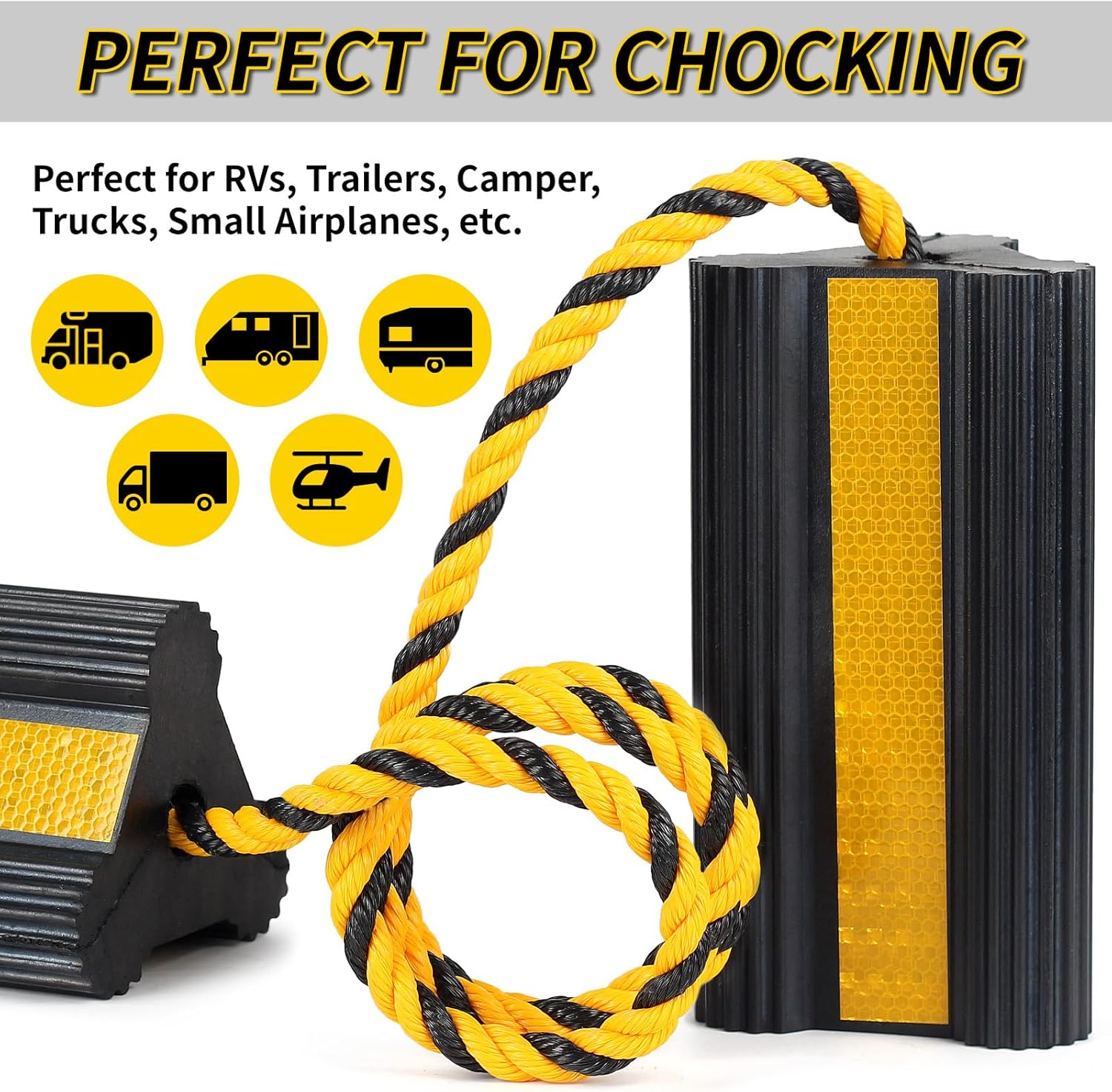 Heavy Duty Rubber Wheel Chocks, 1 Pair, Non-Slip Tire Stopper Blocks with Rope, for RV Camper Travel Trailers Motorhome Aircraft Car Truck