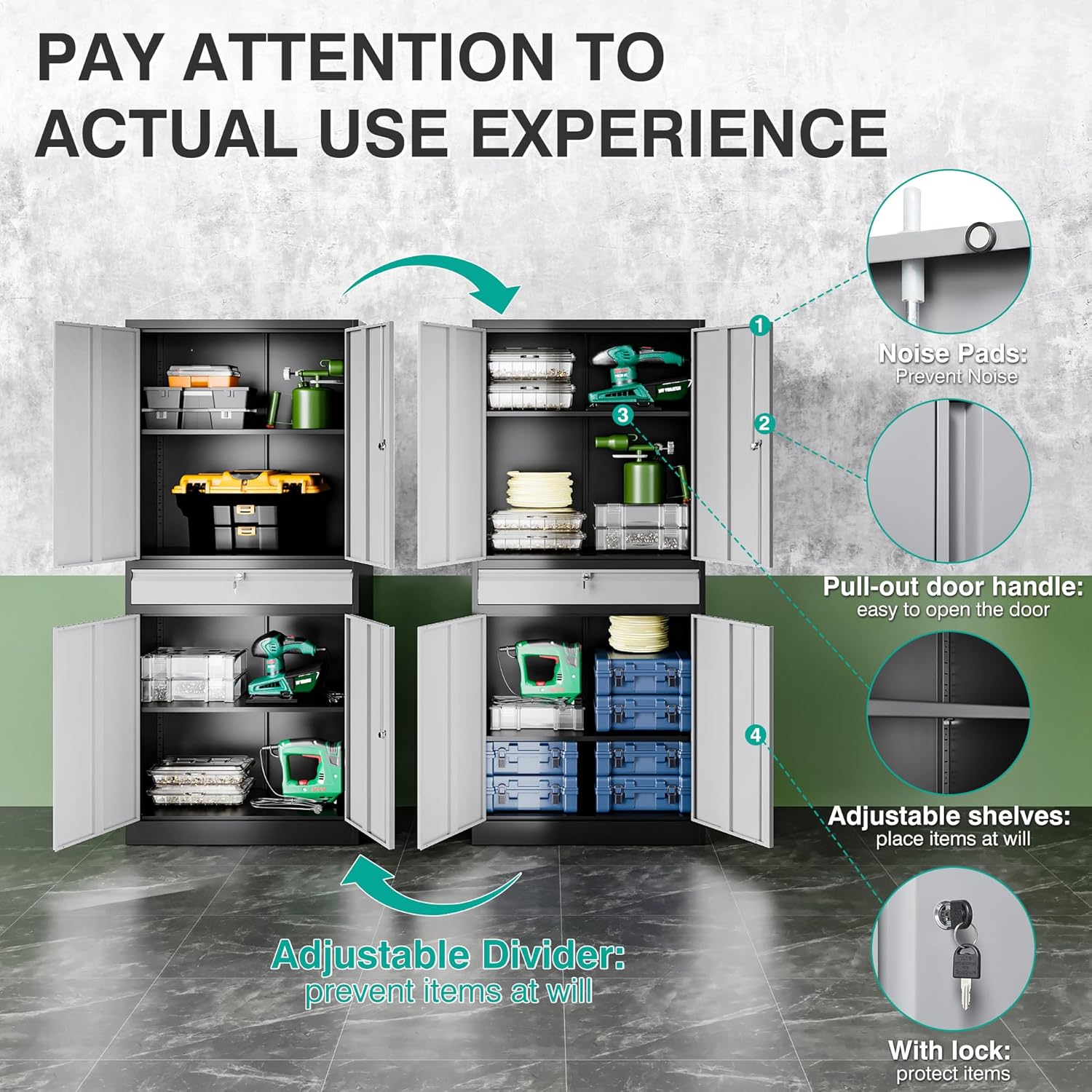 - Adjustable Shelf Design: The garage cabinets storage uses 2 adjustable shelves. You can move to the desired height by adjusting the shelf pegs according to the size of the things. so that you can divide the office storage cabinet space distribution. You can also design garage storage flexibly and remove the shelves for more standing room