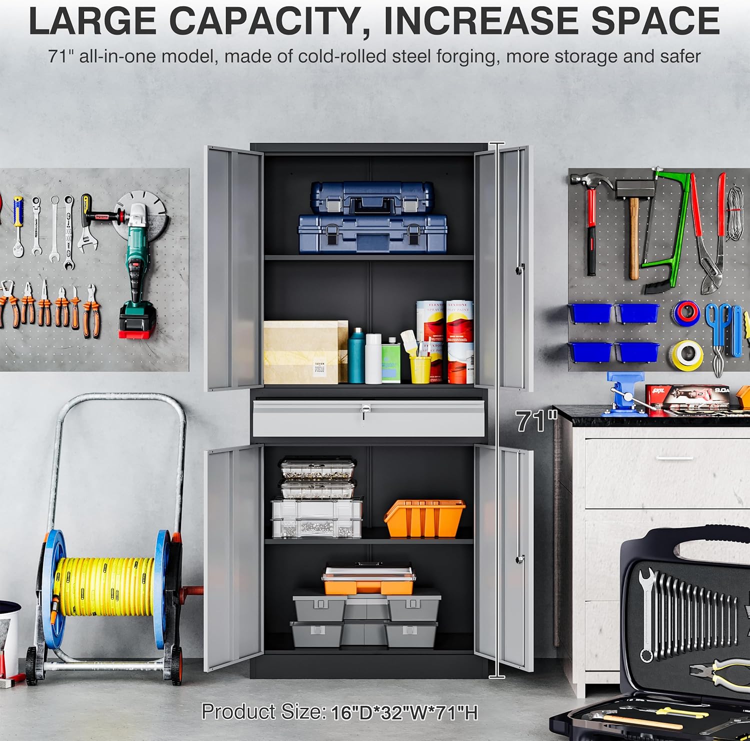 - Large Storage Capacity: Large storage cabinet overall size: 71 inch×31.5 inch×15.8 inches (H x W x D), This metal storage cabinet has a strong and durable metal frame with excellent load-bearing capacity, allowing you to store enough items. Weight Capacity: 600 lbs total, the lockable storage cabinet has 4 adjustable shelves and a drawer, each shelf holds: 180 lbs