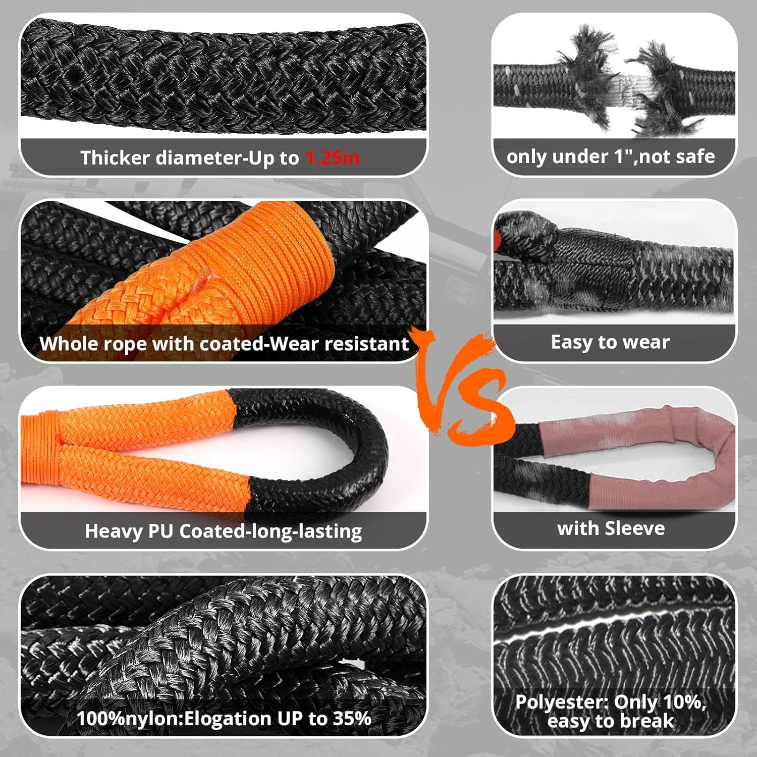 - Extended Durability & Reliability: Each nylon fiber of the whole rope is coated with waterproof polyurethane, protected with 32 strands of double diamond braided nylon rope, sand and mud will not get in.Withstand extreme temperatures from -40°F to 215°F. Heavy PU coating on both ends of the kinetic energy rope,making the Off-road power stretch snatch rope stronger, more durable, wear-resistant and easier to clean than other cloth protective sleeves