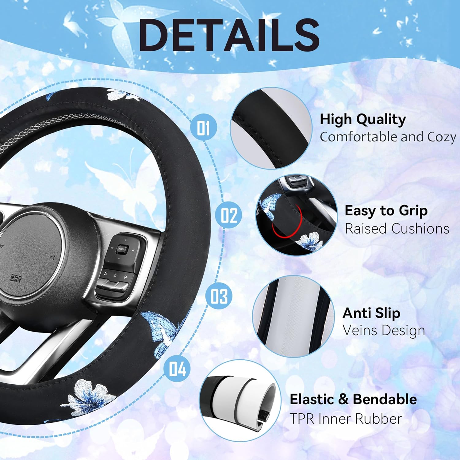 - High Quality Materials:Our black and blue butterfly seat covers can well protect your car interior from stains, spills and daily wear and tear. handmade embroidery butterfly and flower car floor mats with embroidered butterfly steering wheel cover very beautiful and comfortable. Match your interior look perfectly.
