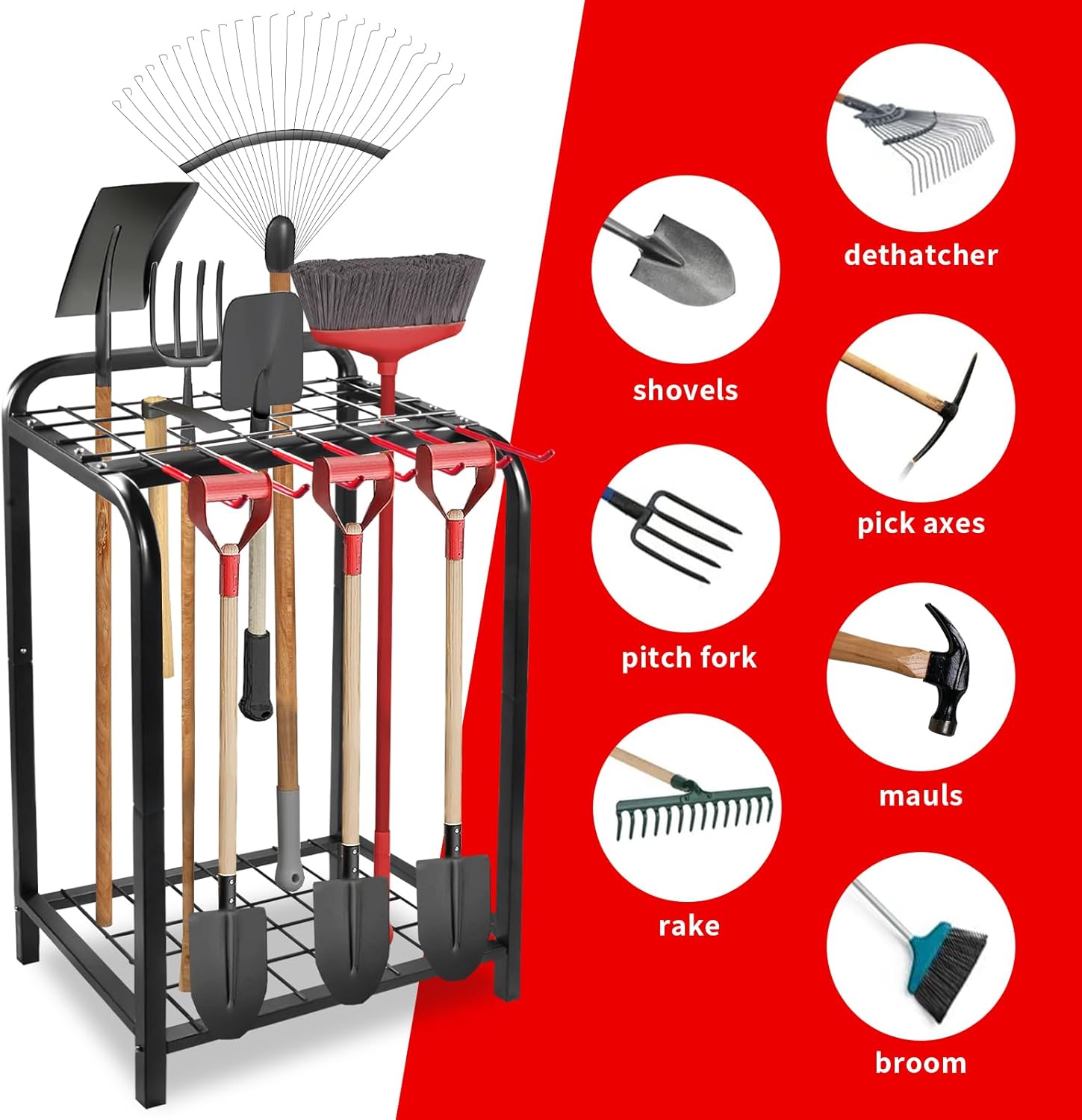 - Widely used and hold all tools - This garden tool storage can easily moved and placed where the tools are going to stay. Such as garages, gardens, sheds, and backyards. Custom-built to store gardening, yard, cleaning, and lawn tools, it easily accommodates items like shovels, pitch fork, rake, dethatcher, pick axes, mauls, broom and bunch of other stuff, it's full! It simplifies tool storage and organization, enhancing space utilization and work efficiency.