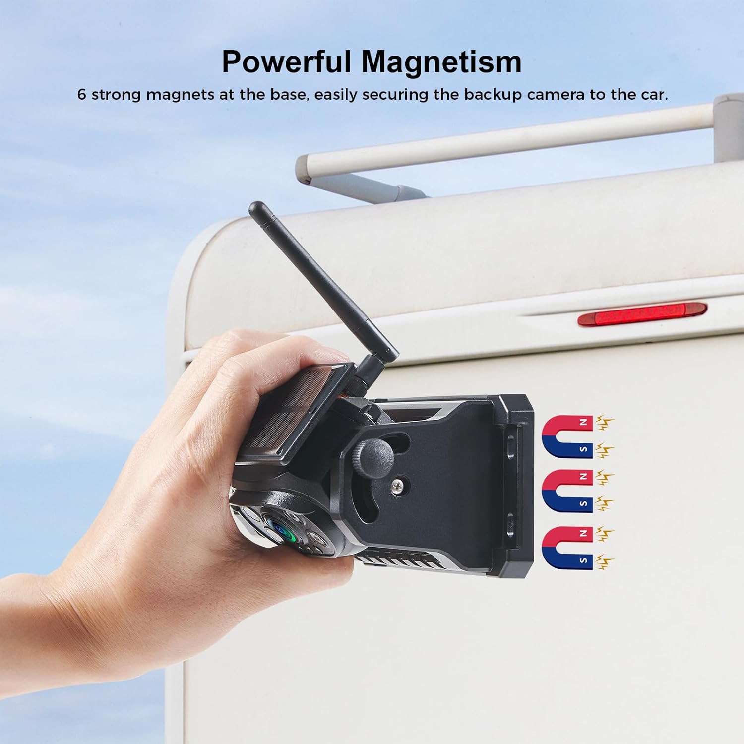 - Strong Magnetic Backup Camera: With 6 strong magnetic magnets on the bottom of our wireless rear view camera, you can simply place the camera on the desired spot, it will be held firmly in place and will not fall down. Enjoy easy installation and removal of the camera, providing flexibility and convenience for your truck trailer RV
