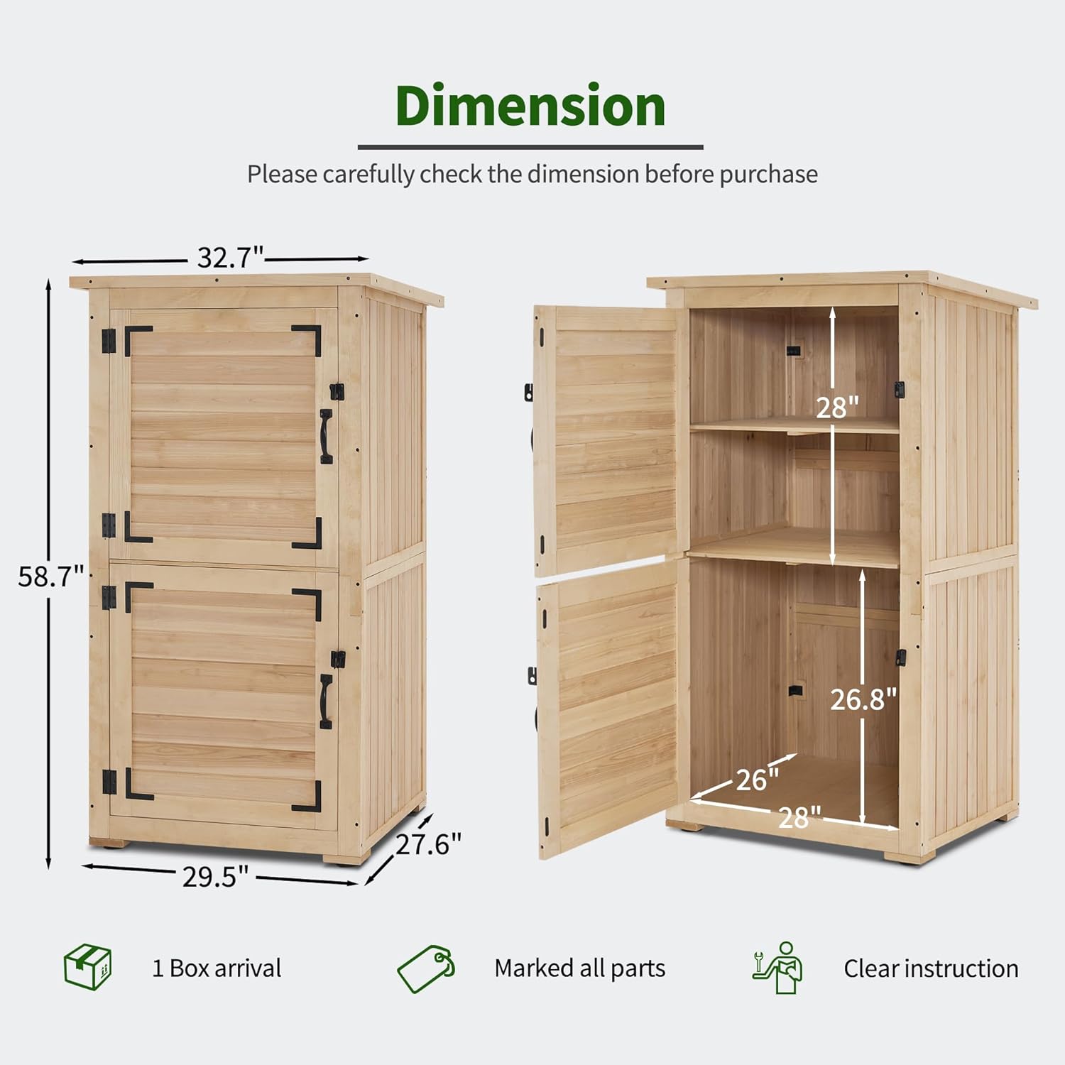 - Fir Solid Wood: The vertical storage shed is made of high-quality pure fir wood, and the exterior has been polished to express a rustic style. Natural Color blends easily with other décor and natural settings.