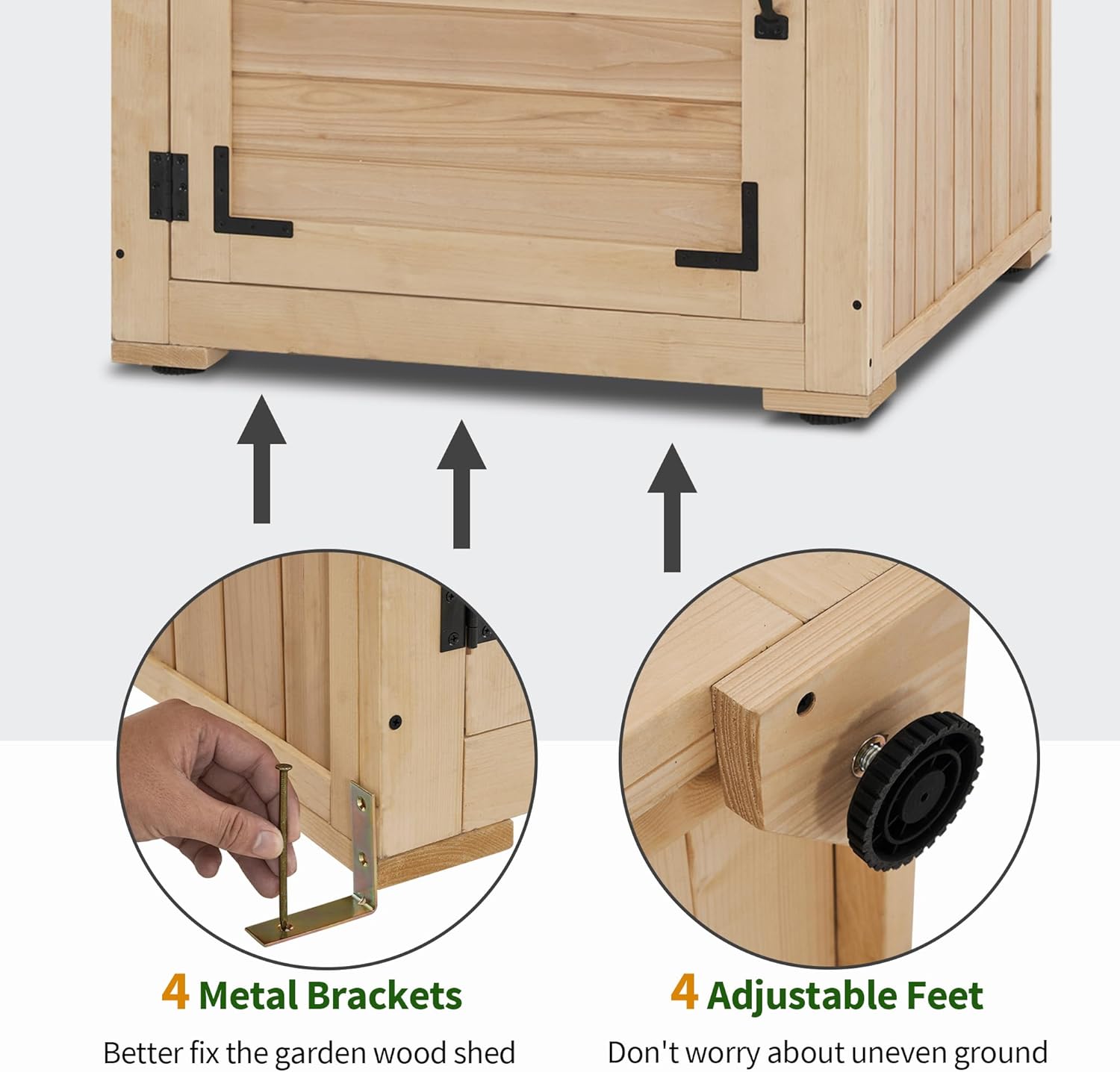 - Adjustable Feet & Metal Ground Brackets: The tool shed has 4 adjustable feet and 4 metal ground brackets to adjust the wood shed, so don't worry about the uneven ground.