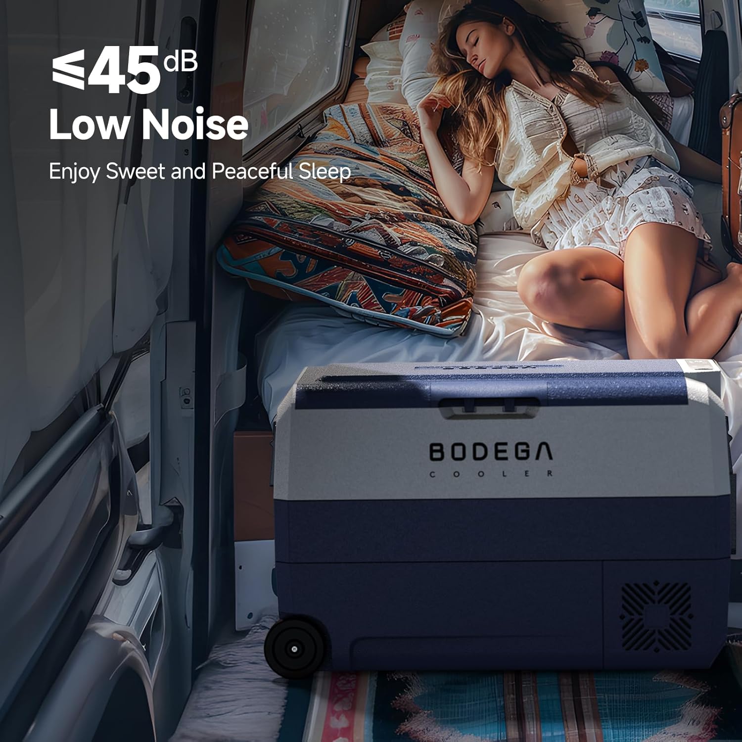 - ANTI-SHAKING: BODEGACOOLER 12v fridge provides a silent and comfortable environment for you.Because of its overall external smooth lines and equipped with a multi-functional non-slip base, the lateral displacement is greatly reduced. When your car is climbing at an inclination angle of 30 degrees, the car portable freezer can still run stably.Our portable car refrigerator allows you to enjoy cold drinks in stable and quiet during the trip.