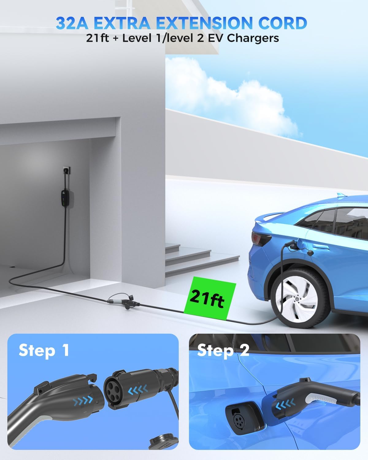 - 【Powerful 32Amp EV Charging Extension Cord】This Level 2 J1772 extension cable supports up to 32 amps, offering powerful and reliable charging with no power loss. Charge your EV/PHEV quickly and efficiently, getting you back on the road fast