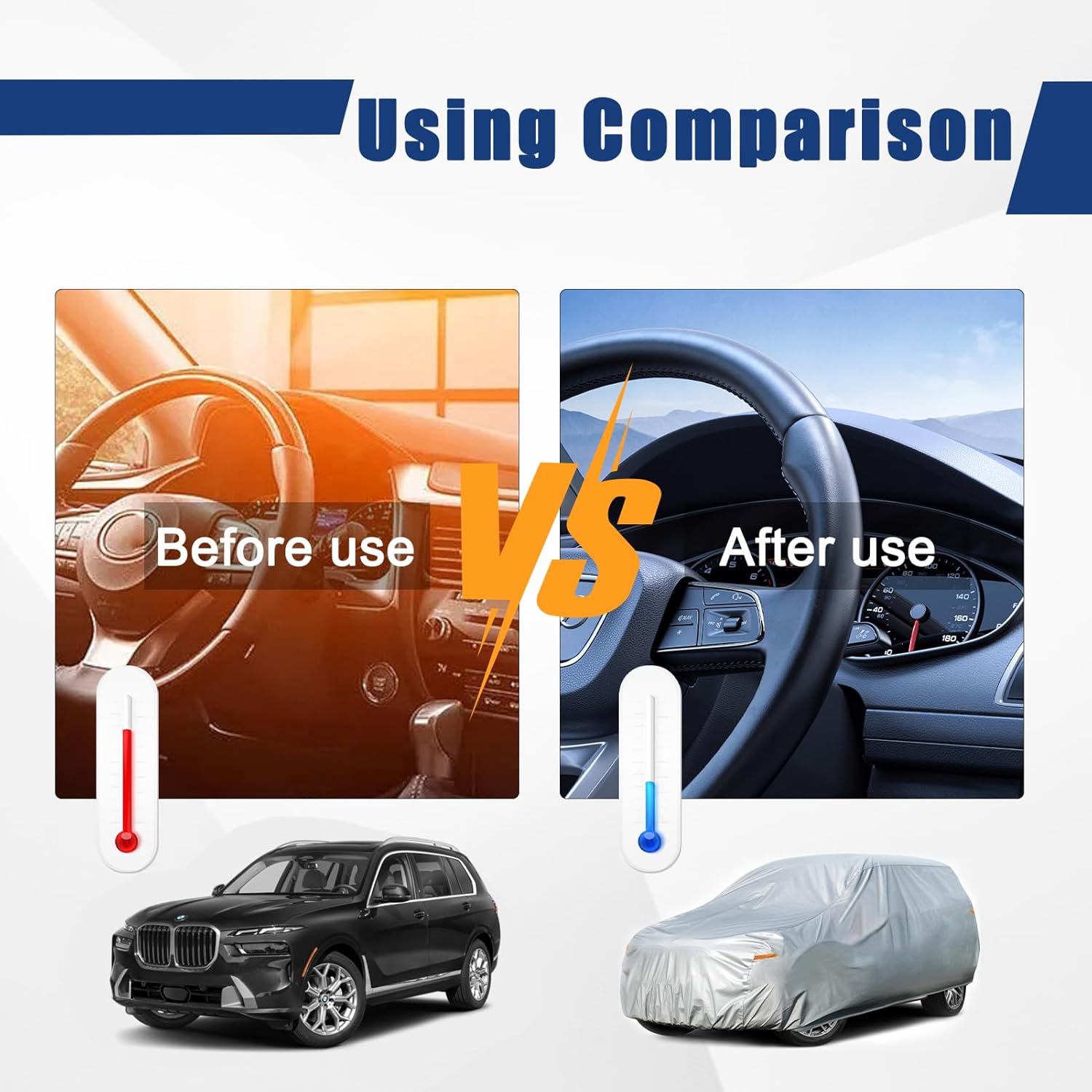 - 【Premium Material】-Kayme 6 layers car cover is made of heavy duty material. 1 PE&PEVA is 100% waterproof, It's great for rainproof snowproofing. 2 High reflective aluminum is good at sunproof and anti-uv, Keep the car cool in the summer. 3 Thicker and soft cotton will protect vehicle painting. Kayme multi-layer material is much thicker and more durable than other similar products.