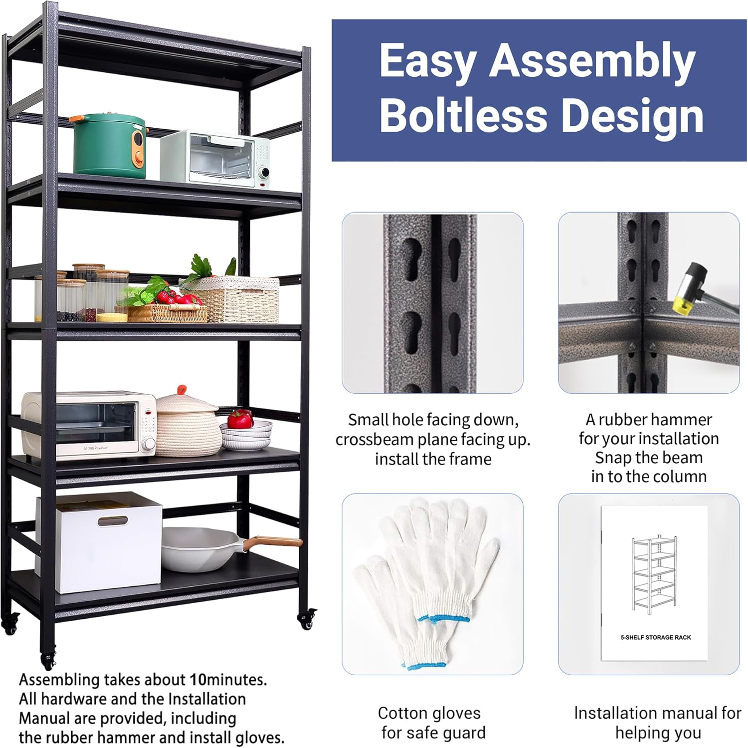 - ăGarage Shelf with Wheels & Protective Railsă: This kitchen storage shelf features four 360°swivel wheels with locking mechanisms, make moving heavier items on the shelf much easier. Wheels are lockable, removable. our shelving unit offers effortless mobility and stability when needed. Each shelf is equipped with protective rails on all sides, preventing items from falling off the sides and providing added security.