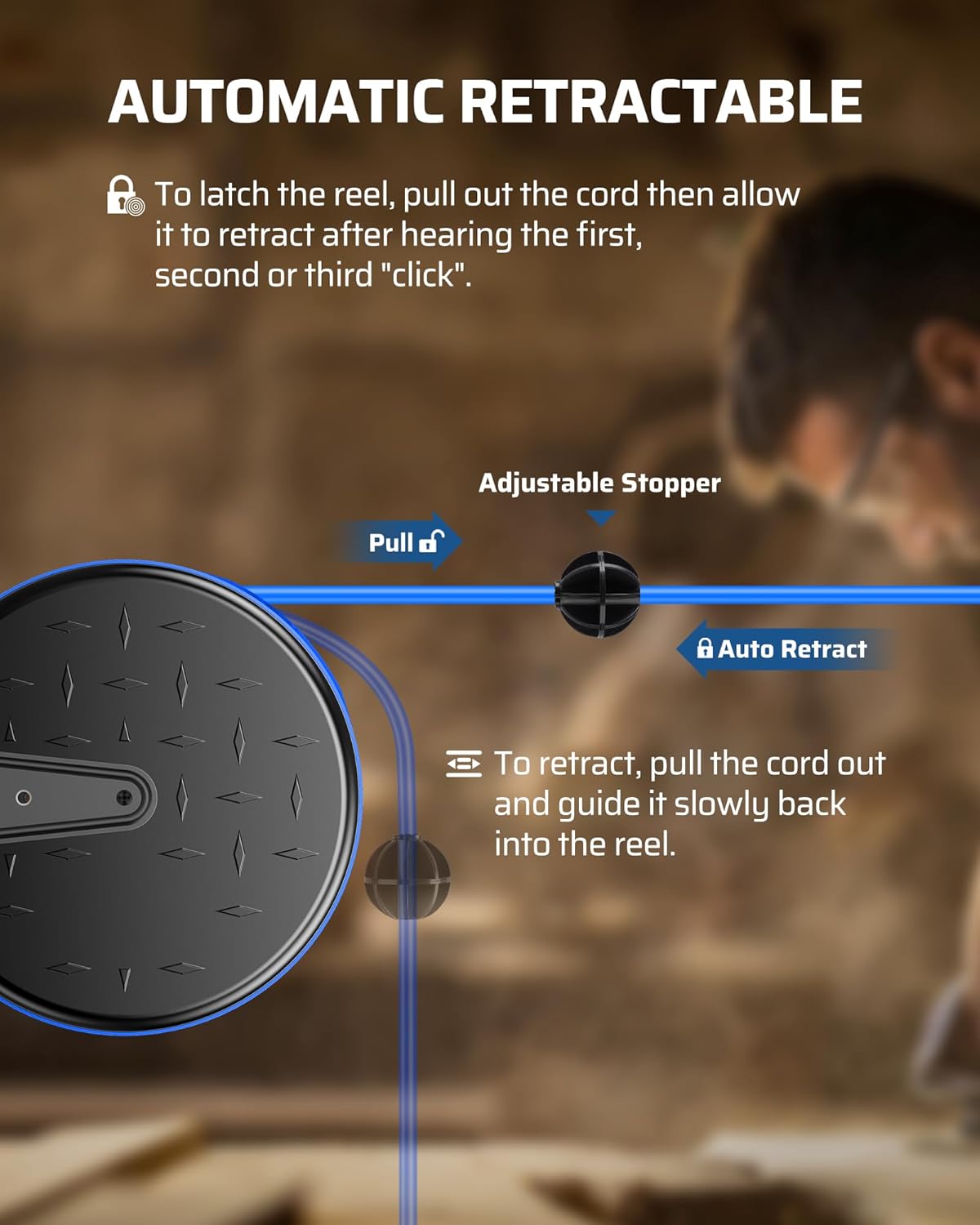 - [30FT Power Cord & 4FT Lead In Cord] Rated for 10A/ 125V/ 1250W, the retractable power cord reel power station has 30 feet long 16/3C gauge SJTW extension cord and 4 feet lead-in cord, and with the stopper is not adjustable, which can effectively prevent the extension cord from fully retracting into the reel