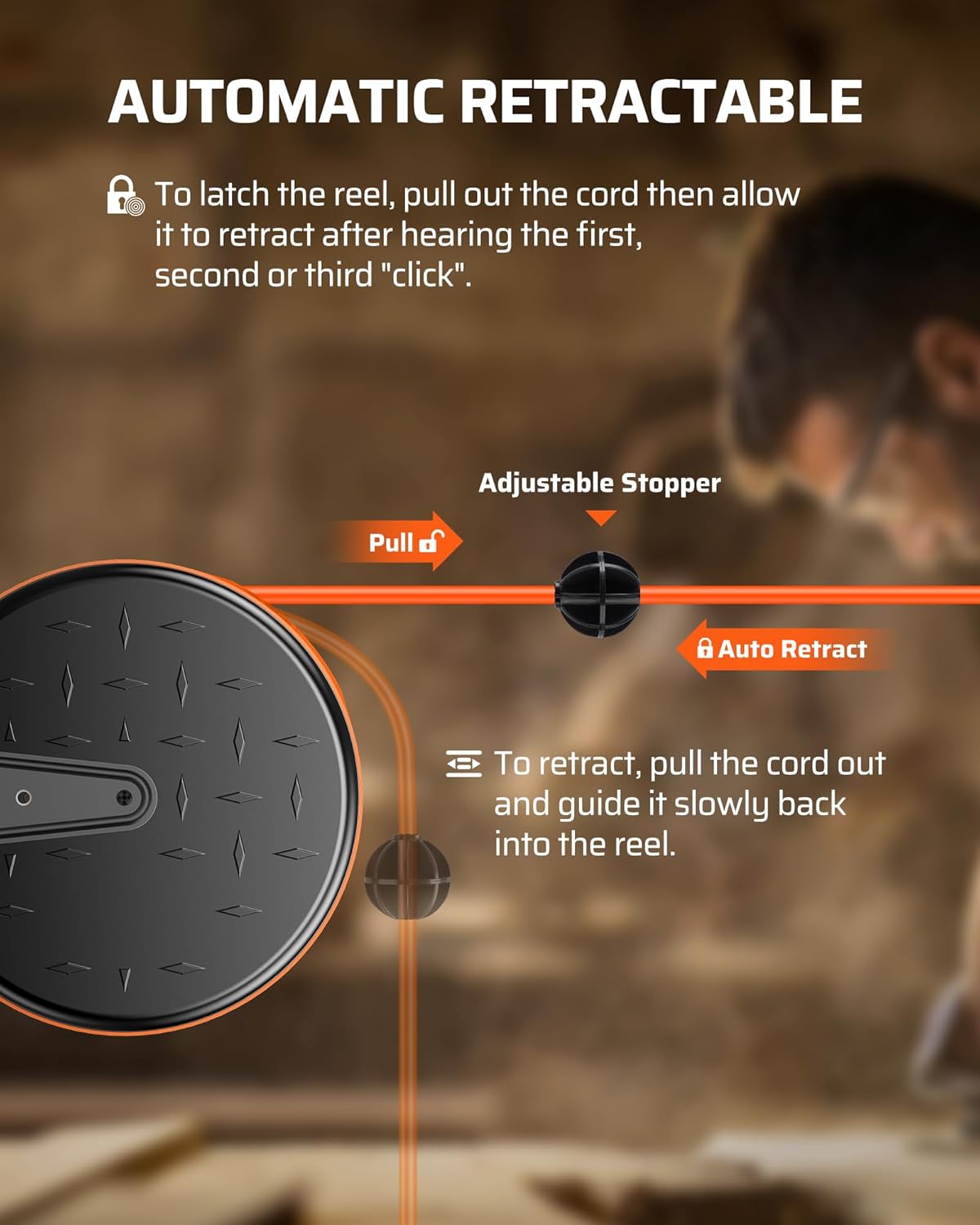 - [Automatic Ratcheting System] With a clever auto-guide rewind mechanism to avoid kinks and tangles, the SJTW extension cord winder will retract quickly and smoothly, also comes with a flexible stopper to adjust the length of cord and prevent the retractor from getting stuck in slot, lock the cord at any length