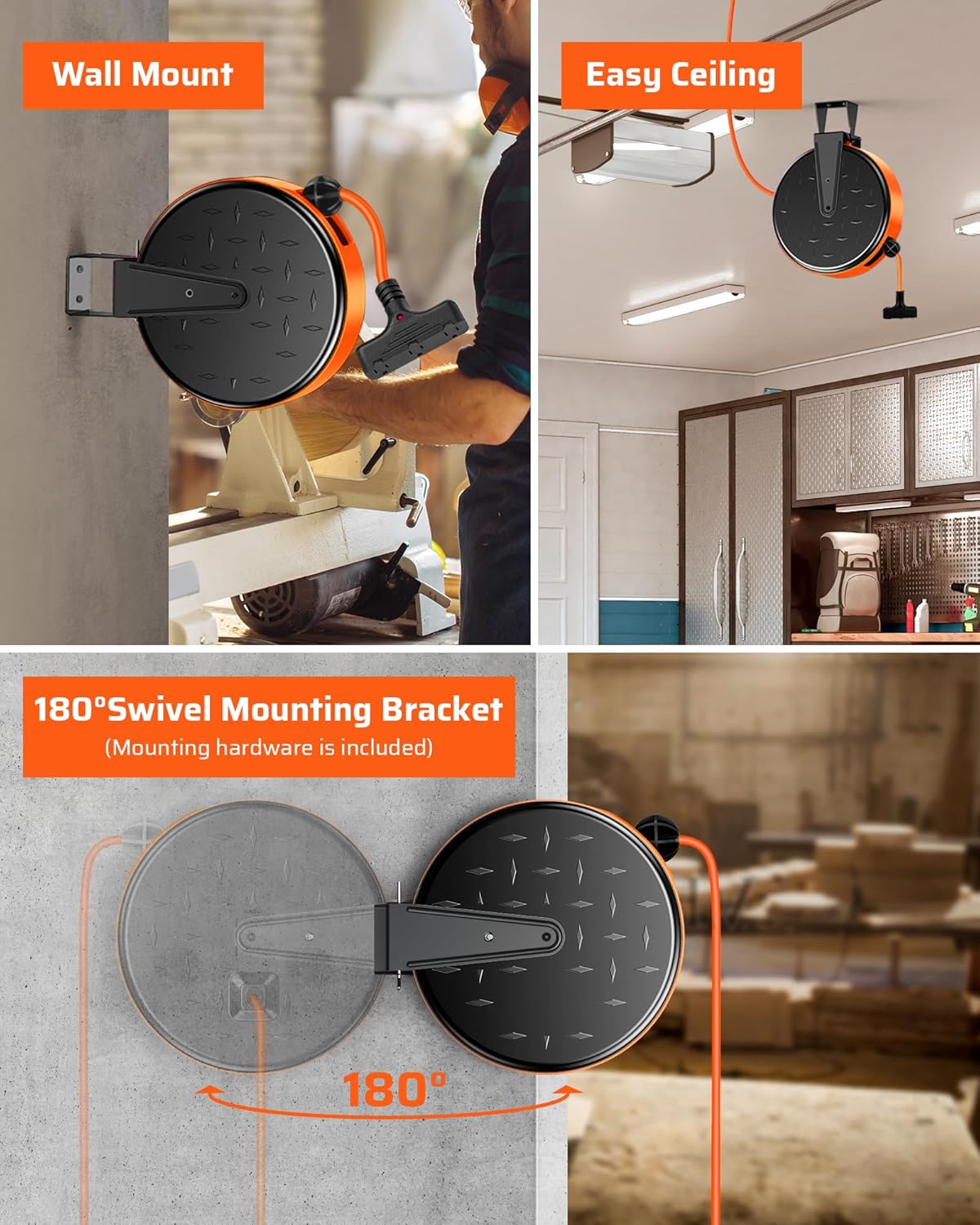 - [Ceiling/Wall Mount with 180Β° Swivel Bracket] The swivel mounting bracket lets the extension cord reel swivel freely up to 180 degrees; perfect for hanging from your garage ceiling or mounting to a wall; easy to pull and release cord, freeing up more workspace and make storage a breeze; avoid tangled cords or people tripping up