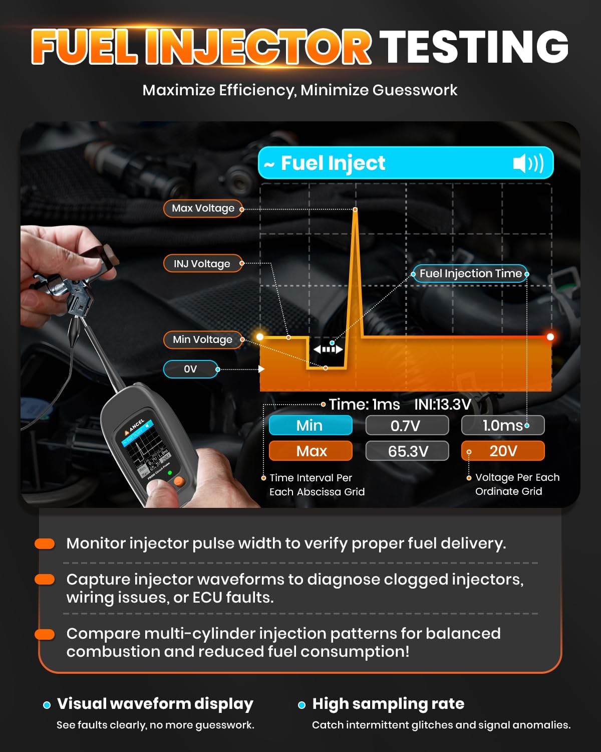 - 🌟【Accurate Fuel System Diagnostics-Specialized Fuel Injection Tests】Struggling with the vehicle starting problems, poor acceleration, or fuel inefficiency? The he PB500 AutomotiveCircuit Tester’s Fuel Injection Test Mode is designed for fast, precise diagnostics of the fuel injection circuit. It quickly analyzes the fuel delivery process, ensuring that each injector is firing precisely as it should. Plus, the addition of Frequency and Duty Cycle modes allows you to dig deeper into your vehicle's performance, uncovering issues that standard diagnostic tools can't detect, and giving you the insights you need to make accurate repairs and get your vehicle running at its best.