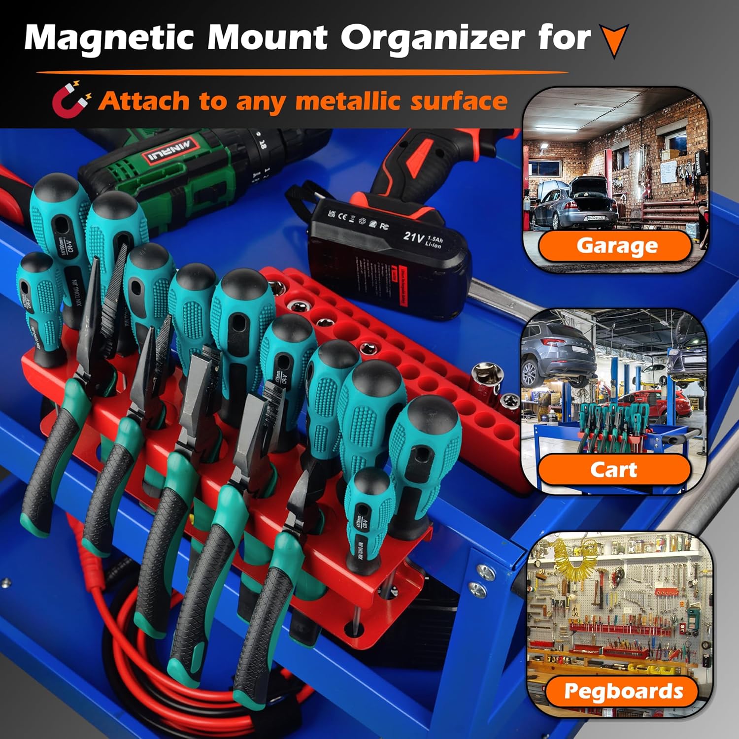 - [Utility Storage Tools Rack]: The bottom of the holder has a rubber magnet, which has strong force and anti-slip resistance to ensure that the rack will not slide during use. It can be installed on tool carts, workbench, pegboard and other metal surfaces