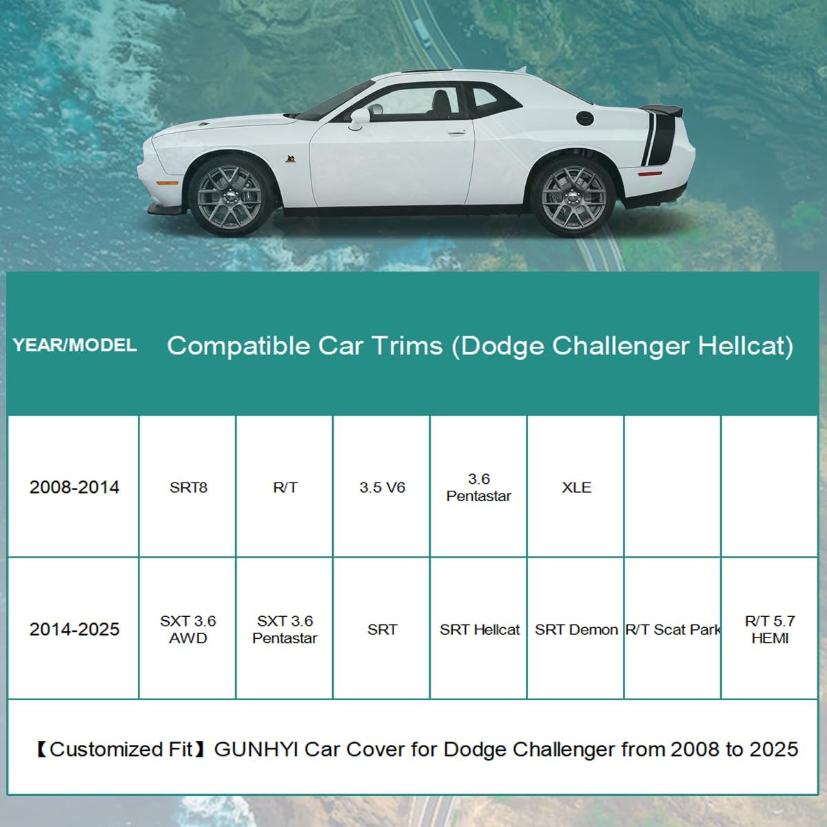 - ăCompatible withăThis Full Car Cover Custom fit for Dodge Challenger Hellcat from 2008 to 2025. Comes with a microfiber towel that you can use to clean your car, because if there is sand on the surface of the car before use, it may damage the paint.