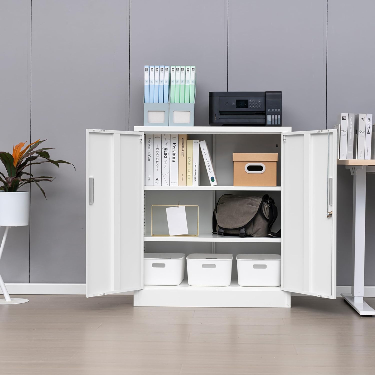 - ADJUSTABLE SHELF: Two shelves in the metal cabinet can be adjusted freely to provide adaptability and convenience. There is plenty of safe space to organize tools, household items, office supplies, books, file, food, etc.