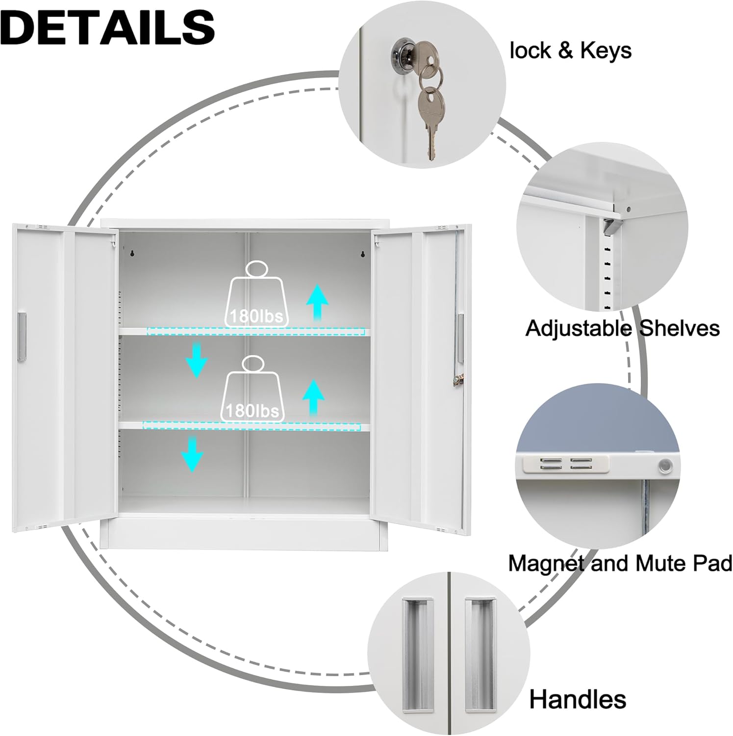- MULTIPURPOSE: Metal storage cabinet with doors and shelves provide large and safe space. Magnet design keep the cabinet closed and mute pad could avoid noise. Metal cabinet with lock is a good choice for the garage, office, laundry room, home, utility room, workshop, school, basement, living room and so much more.