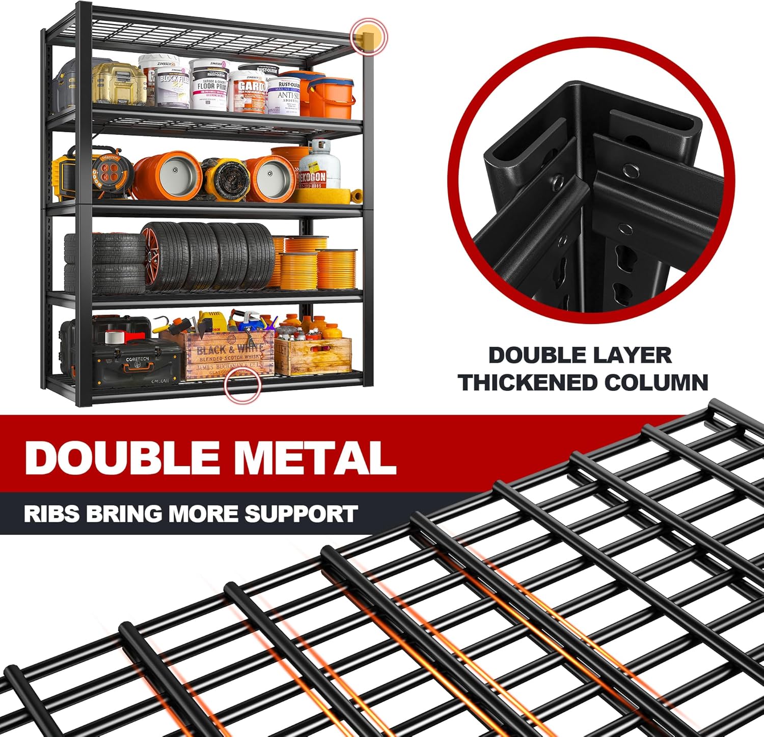 - ă2500LBS Capacity Super Sturdy Metal Garage Storage ShelvesăThe REIBII Garage Shelving adopts thickened double-layer columns, each metal shelving with additional reinforcing ribs. Each layer can withstand a weight of 500 pounds, with a total bearing capacity of 2500 pounds. Such strong load-bearing capacity and high-quality metal materials make this storage shelves more sturdy and stable than the flimsy MDF storage shelf