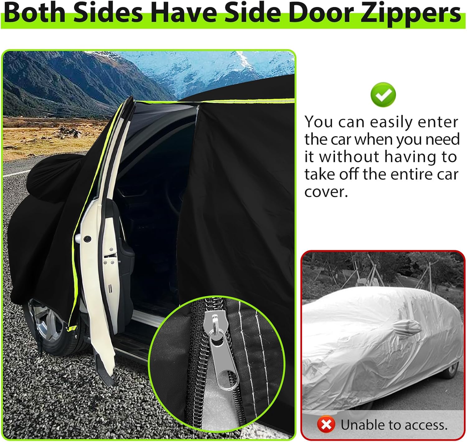 - ăProfessional designă(1)The car cover has door zippers on both sides, making it convenient for us to retrieve our car contents at any time without the need to remove the cover again. (2)The entire vehicle is equipped with green reflective strips, which can allow pedestrians and vehicles to see the outline of your car in the dark at night, avoiding accidents. (3)There are straps on all four wheels to better secure the car cover and prevent it from being blown away by strong winds. ïŒ4ïŒProvide two extra long ropes to better secure the vehicle body, making it less likely to be blown away even in typhoon weather.