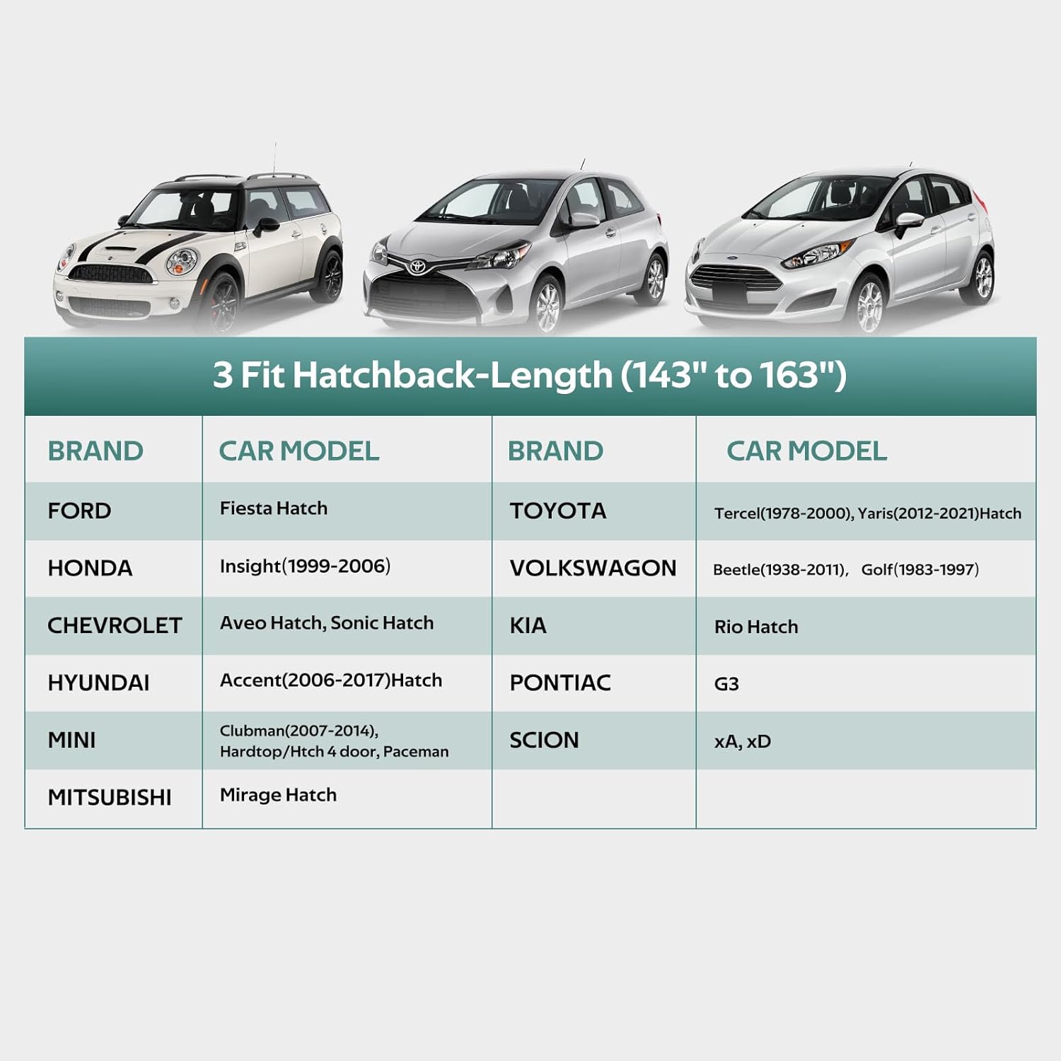 - ăCHOOSE THE RIGHT MODELă: Molebt car cover fits for hatchback up to 163 inch. For example Toyota Yaris, Honda Fit, Kia Rio, Mini Cooper Coupe/Convertible, Mitsubishi Mirage, Chevrolet Bolt/Sonic, etc.