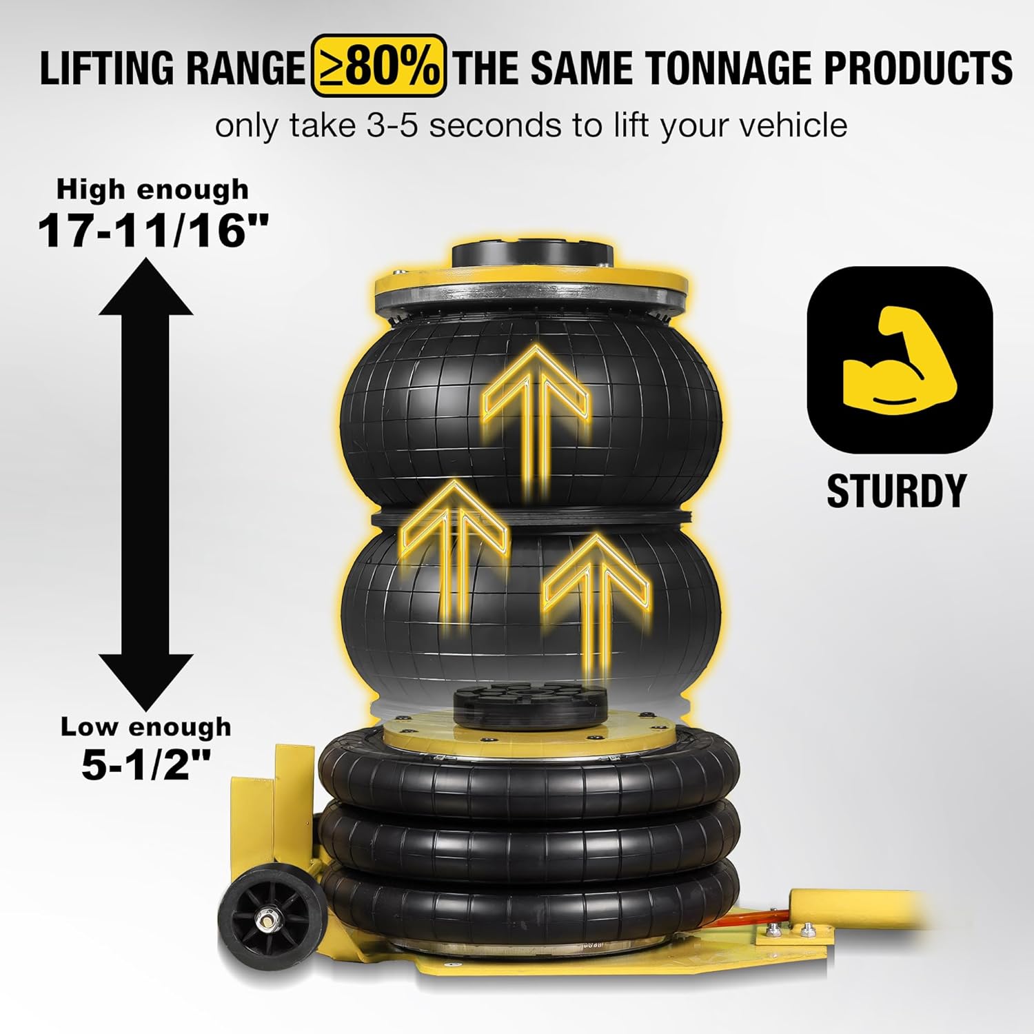 YELLOW JACKET Air Jack 3 Ton Triple Bag Air Jack with Six Steel Pipes, Portable Pneumatic Jack with Long Hand, 3-5 s Fast Lifting Airbag Jack for Cars, Garages, Repair, Yellow