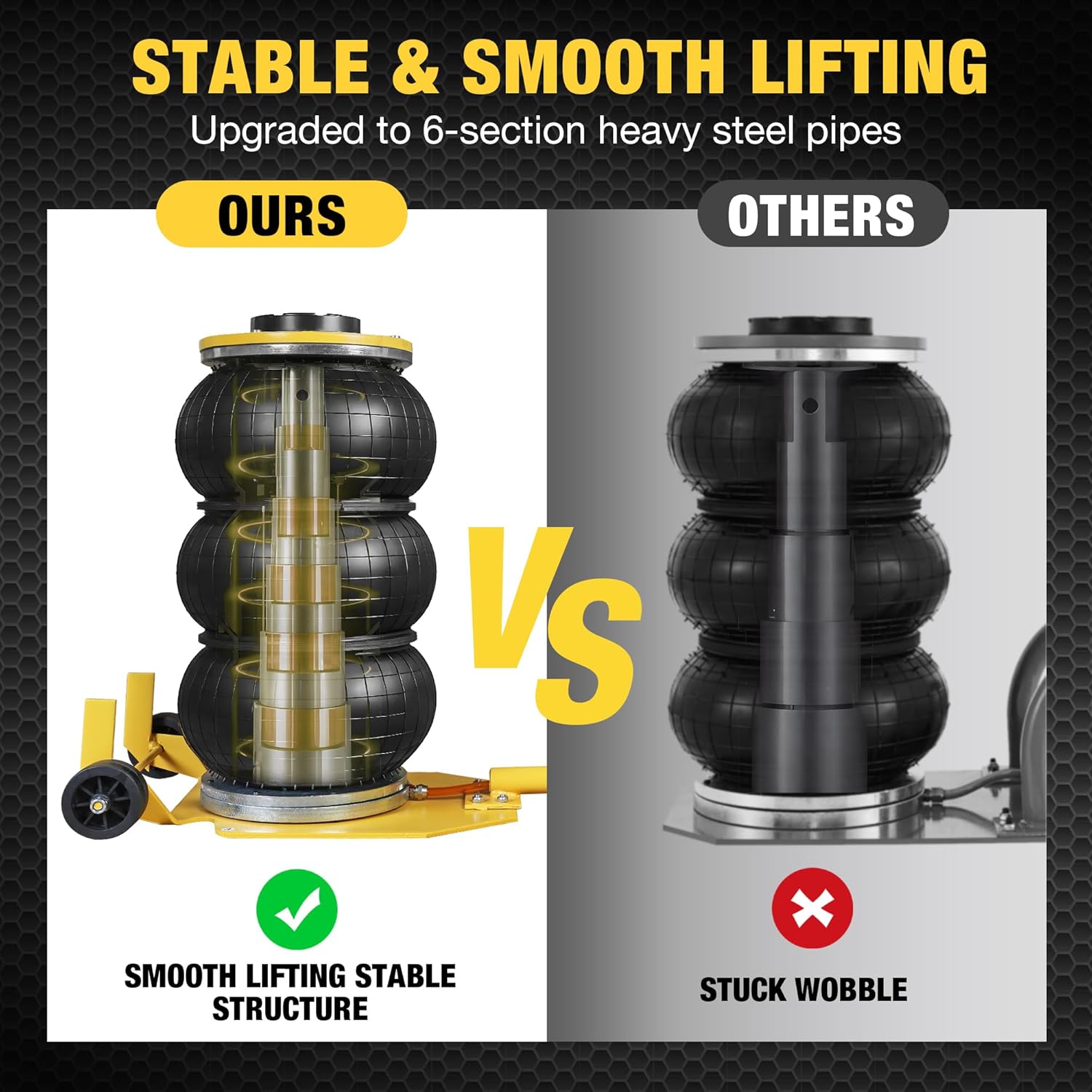 - Smooth and Reliable Operation: The airbag jack is composed of 6 steel pipes, and its height and structure are strategically optimized. This scientific design enhances its stability even when lifting heavy vehicles. Experience seamless ascension without worry.
