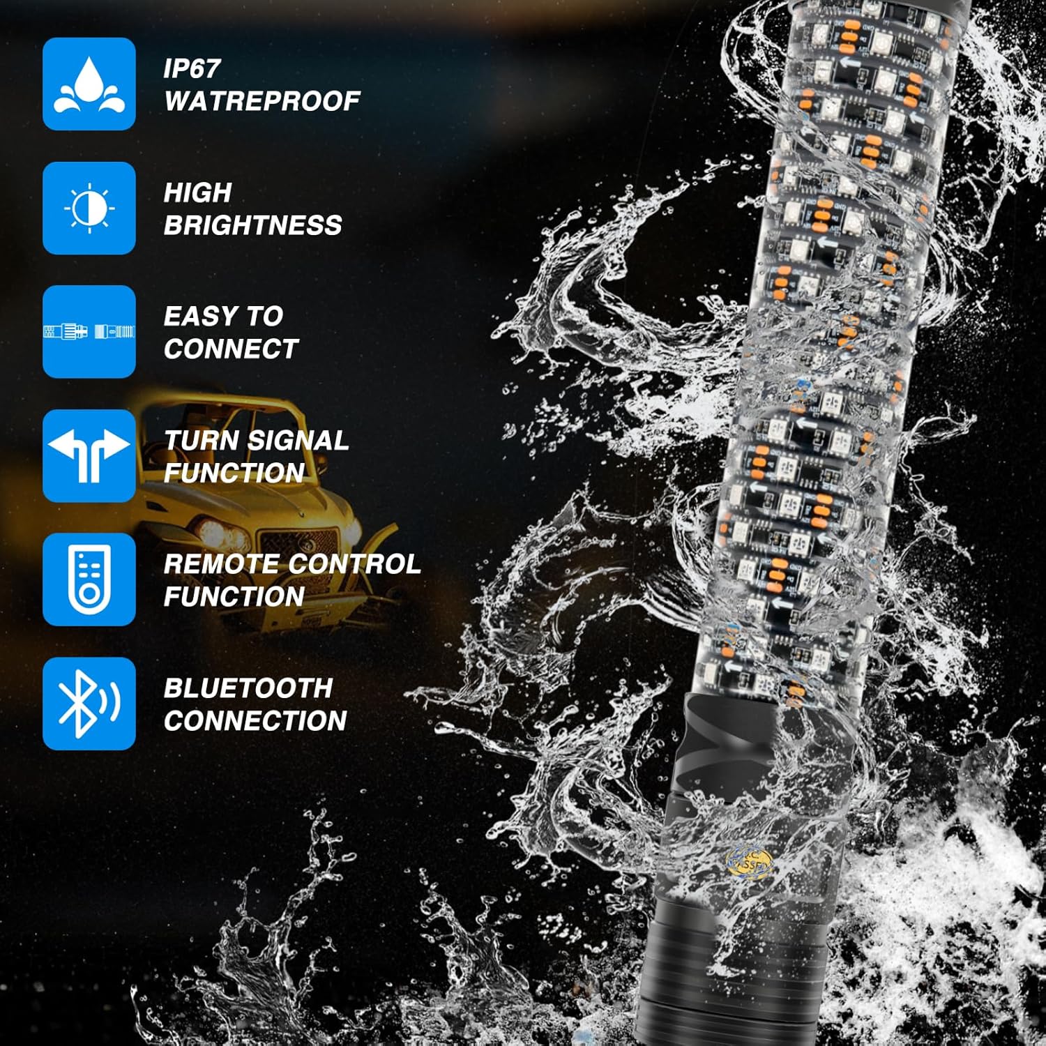 - 【Dual Control & Music Synchronize】Dual control by Bluetooth APP and handheld remote with a hook,the ATV whip light can dance to the rhythm of your phone's music and change colors and flash patterns to maximize the thrill of off-roading.Users can personalize their desired combination of lights and easily adjust colors Strobe, color width, direction of motion, brightness, speed and color,bringing more fun to driving.