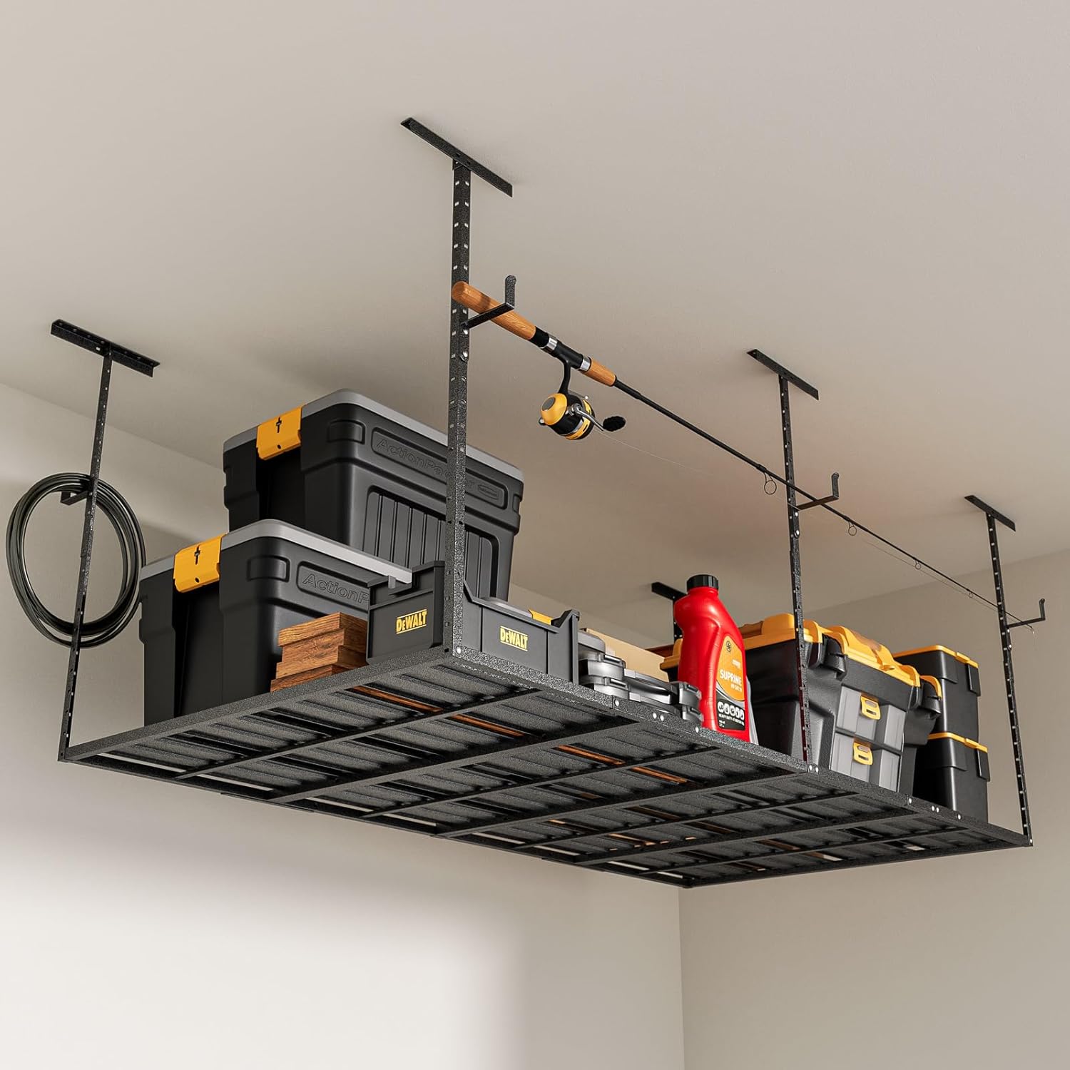 - Enduring Craftsmanship: To ensure that your investment stands the test of time, we have integrated a rust-resistant process into the design. This feature guarantees that, even in challenging garage environments, your overhead shelving will maintain its structural integrity and visual appeal for years to come.