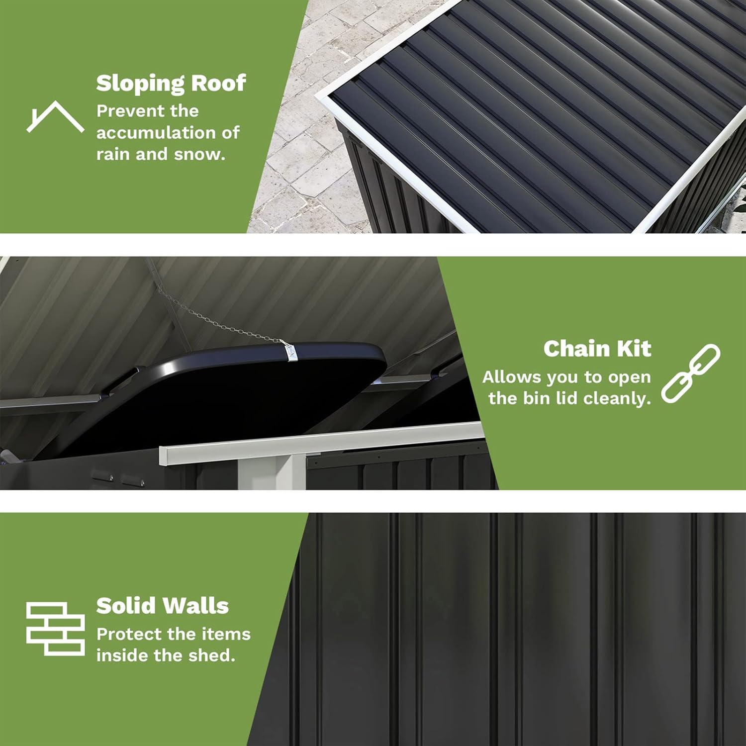 - Convenient Garbage Shed -- This storage shed is perfect for placing trash cans. You can easily open the top lid with the gas spring. The chain on the top of the shed allows you to pull up the lid of trash can without having to touch the trash can.
