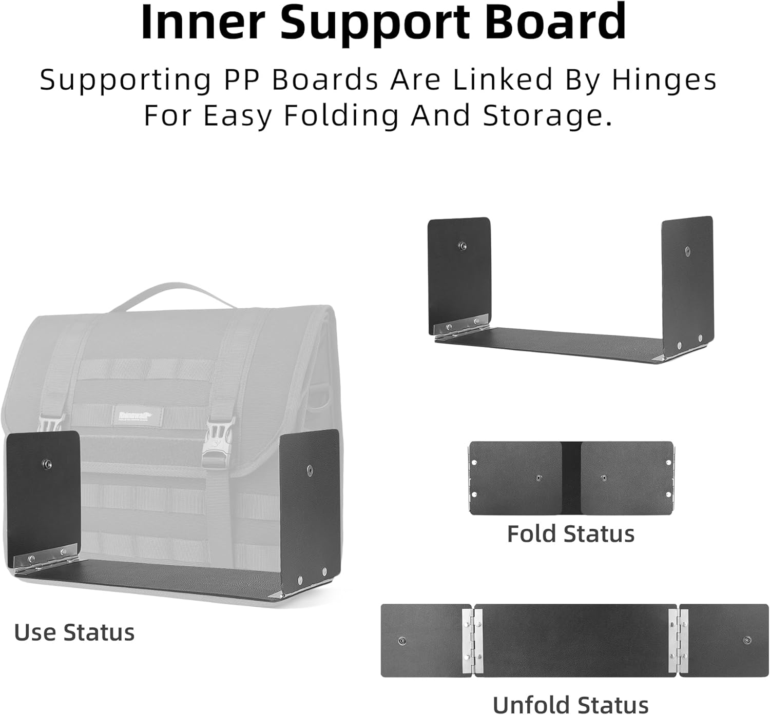- 【Waterproof & Anti-skid】 Thicker and higher density 1200d waterproof material. the inner bag is coated with water pressure resistance of 6000mm, and the seam cr ossing are hot pressed waterproof adhesive tape can prevent rain penetration. Inner supporting pp boards are linked by hinges for easy folding and stroage. Anti-slip leather on the part that fits the frame to prevent the frame paint from being worn away.