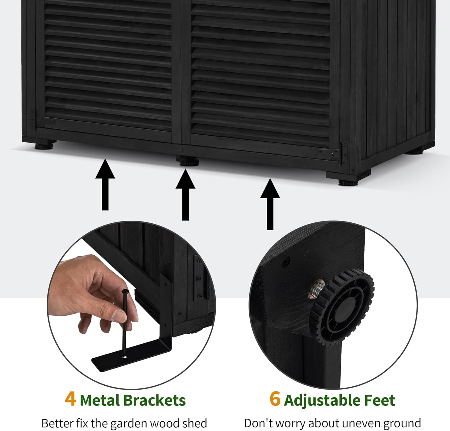 - Adjustable Feet & Metal Ground Brackets: The vertical storage shed has 6 adjustable feet and 4 metal ground brackets to adjust the wood cabinet, so don't worry about the uneven ground.