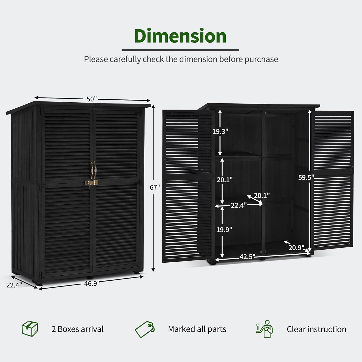 - Multiple Storage Spaces: The outdoor storage cabinet has 2 shelves for various items, 1 large space for long tools.