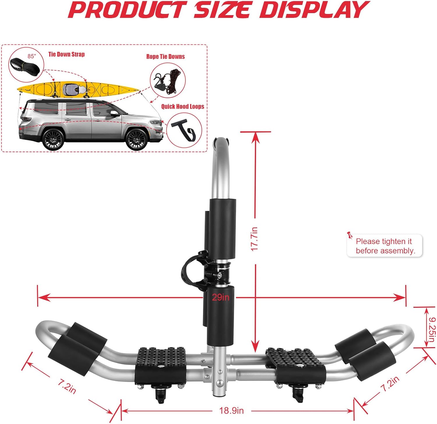 - ăPerfect AccessoriesăWith 4 ratchet belts, 4 10ft S-hook ratchet pulleys straps, and 4 anchor belts, you can carry your kayak anywhere with confidence. In addition, we have specially designed the position for the paddle, so you don't have to put any accessories in the car.