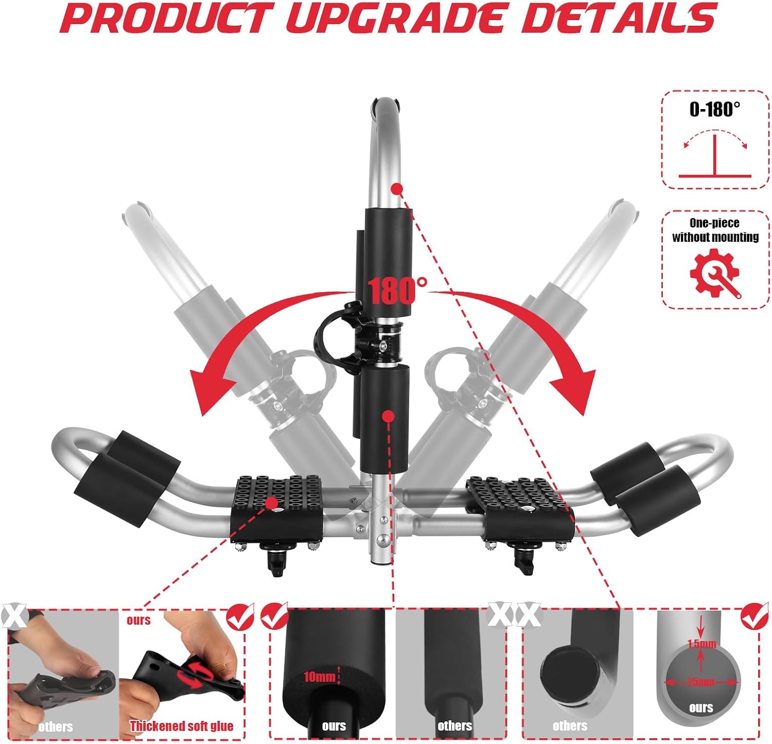 - ăFold Designă Use the handle to adjust the rack from 0° to 180° and fold it to adapt to different shapes of kayaks. The adjustment part is made of aviation grade aluminum rather than plastic, which is consistent with the shelf material, which is more firm and convenient.