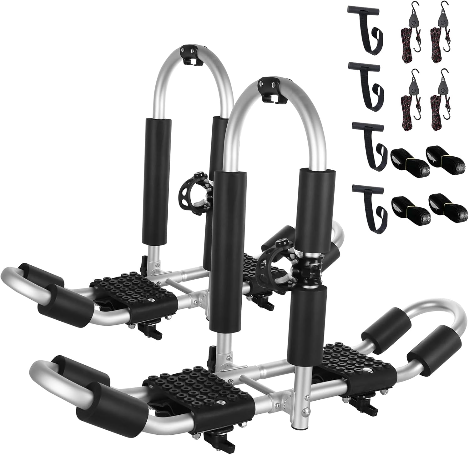 - ă2 In 1 Designă The rack features a 2-in-1 design for easy installation and robustness.Two kayaks/canoes/boats are carried at the same time, which requires 4 traditional style racks, We only need 2, which is more convenient and easy to enjoy your holiday.