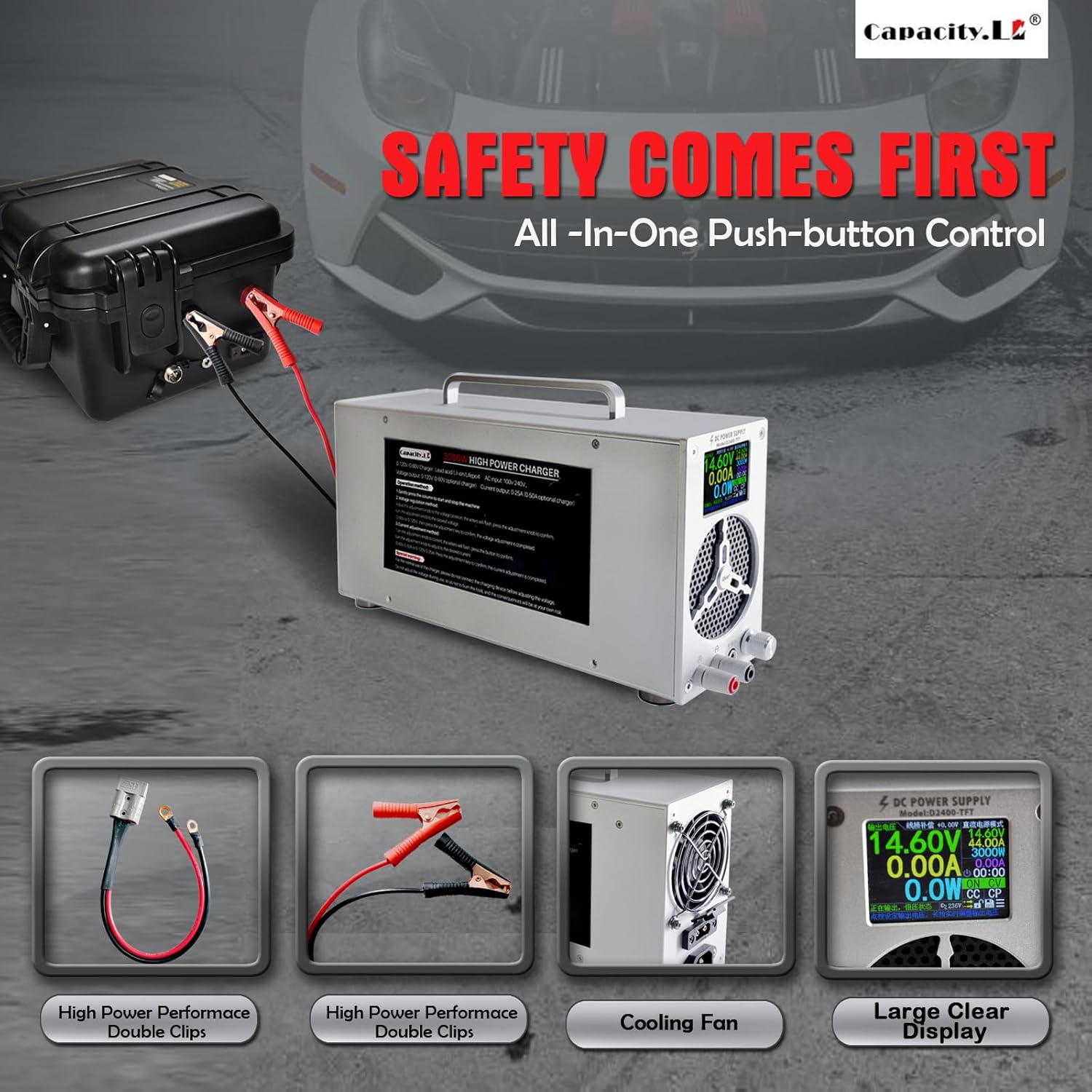 - MULTIPLE PROTECTIONS--Capacity. Li high power LiFePO4 lithium batteries charger adopt ABS flame-retardant shell, fireproof, anti-shock, corrosion resistance, sturdy and durable, built in circuit protection, spark free system, reverse polarity protection, over-charge, over-voltage and over-temperature protection. The intelligent LCD display shows the charging status and battery status, so that you can charge more at ease. Please read the instructions carefully before proceeding.