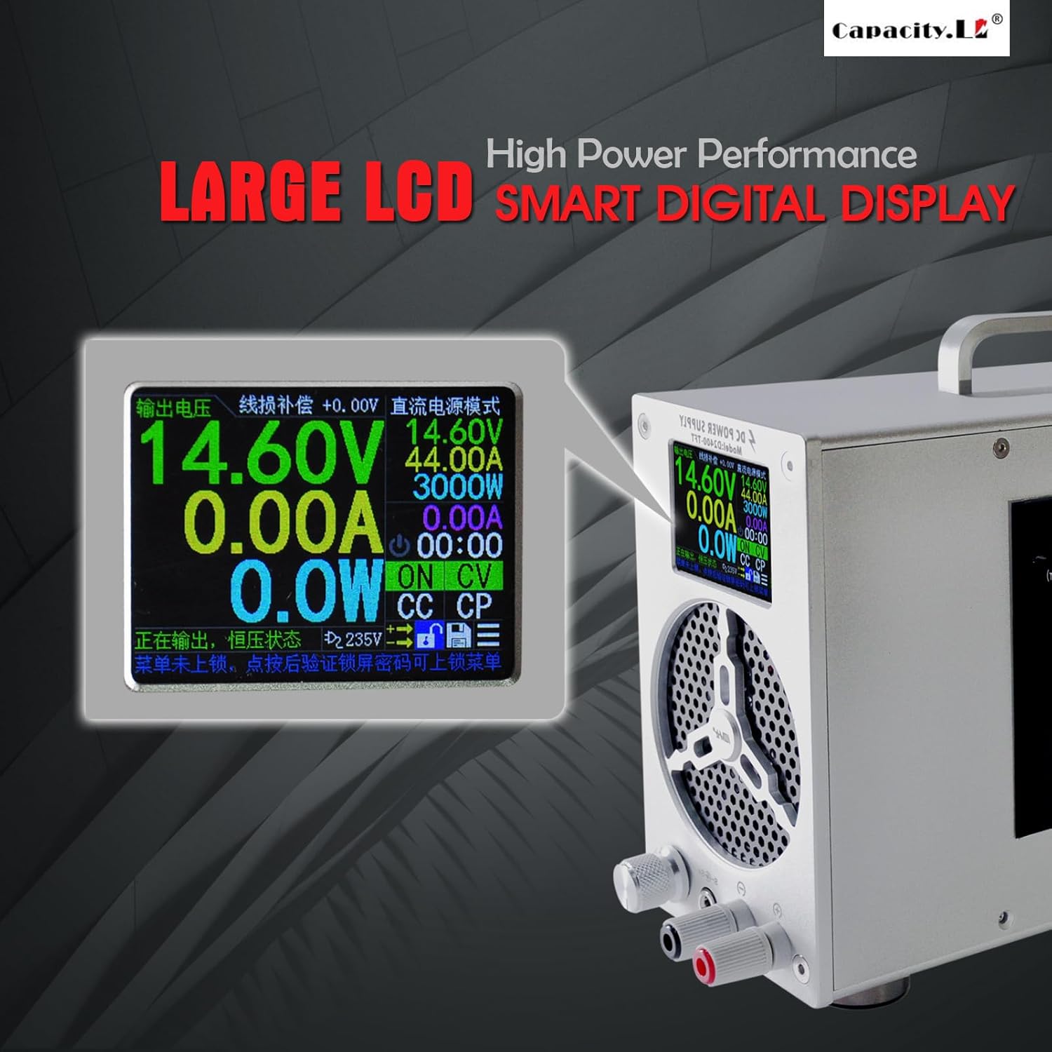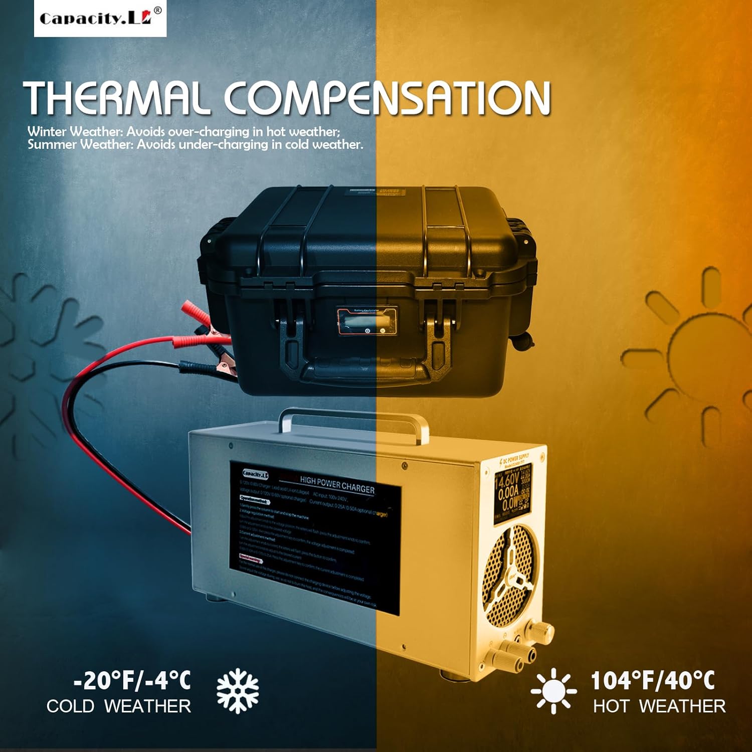 - UPGRADED QUALITY MATERIAL: Capacity.Li lifePO4 battery charger is made of aluminum alloy, with surface oxidation treatment, high hardness, anti-drop and moisture-proof, anti-oxidation, built-in low noise cooling fan, keep the charger itself cool. Cooling protects your charger and battery. Product size 13.78 x 7.08 x 3.54 inch, Weight 3.77kg, easy carry and control.