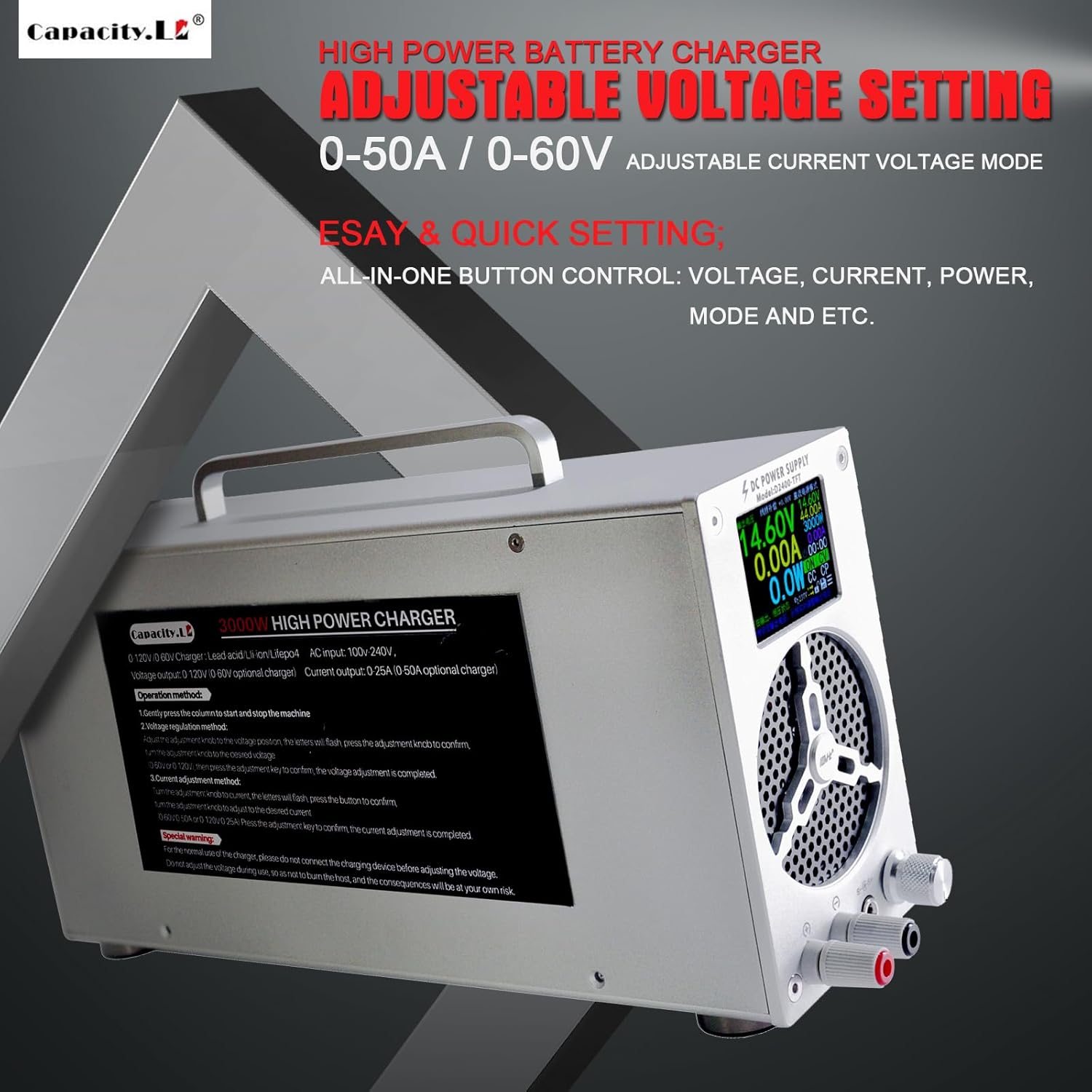 - EASY TO CONTROL & DUAL SCREEN DIGITAL DISPLAY: High power lifePO4 battery charger with adjustable voltage 0-60V & current 0-50A, Multi modes are all in one control switch, easy to control charging. Equipped with a dual screen digital display design, accurate to the last two decimal places, more precise, clear, and convenient for adjustment and viewing.