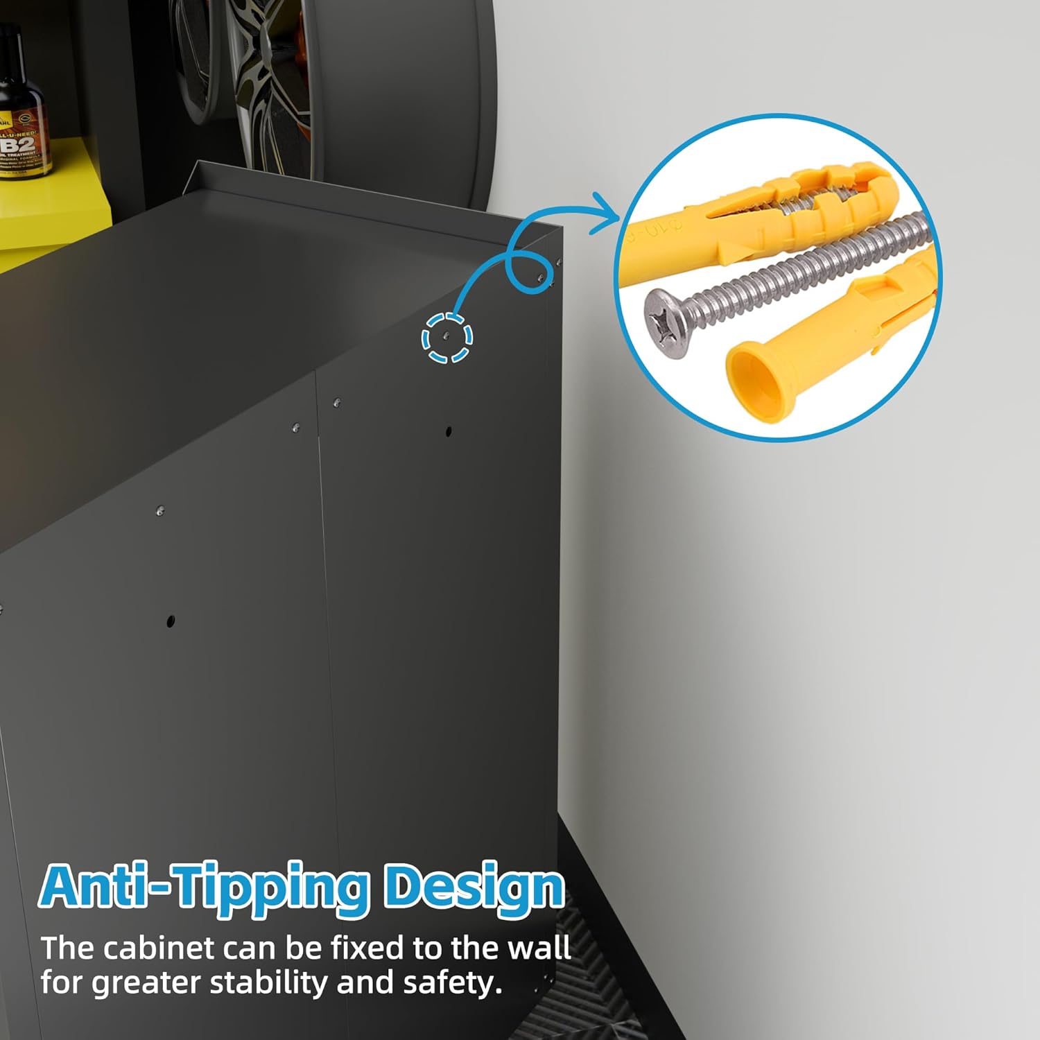 - 【Adjustable Shelves with Locking 】Metal storage cabinet with adjusted shelf in height to meet different storage needs.Steel storage cabinets with locker and effective in securing your documents and personal belongings.Storage cabinet door comes with hole panels and Hookrage so you can adjust the height of the brackets to hang tools.