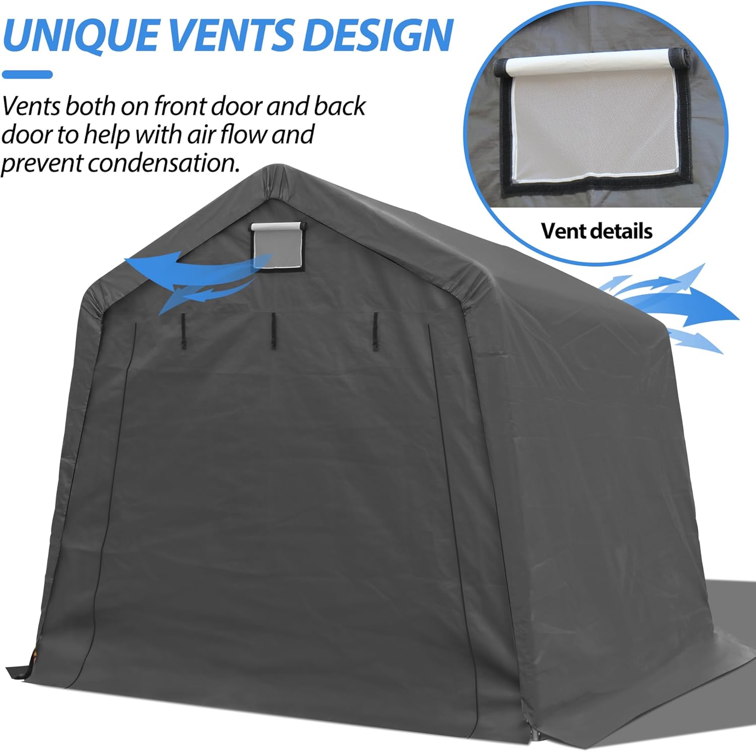 - STURDY FRAME&MORE STABLE: (Please do not use in strong wind and clear the snow promptly.)Our portable shed is made of premium galvanized steel, which can withstand all weather conditions and remain stable even during winds. Comes with extra frame lock, strong rope, ground stakes for stability.