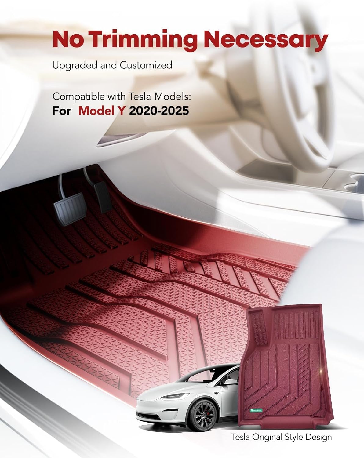 - Mats for Tesla: YHTAUTO floor mats fits your Tesla Model Y 2020-2025 like a glove; 3D-technology car mats with Tesla aesthetic "T" pattern can be preferred as a gift, package contains 3 x Floor Mats + 1 x Rear Trunk Cargo Liner + 1 x Rear Trunk Lower Storage Liner + 1 x Front Trunk Cargo Liner