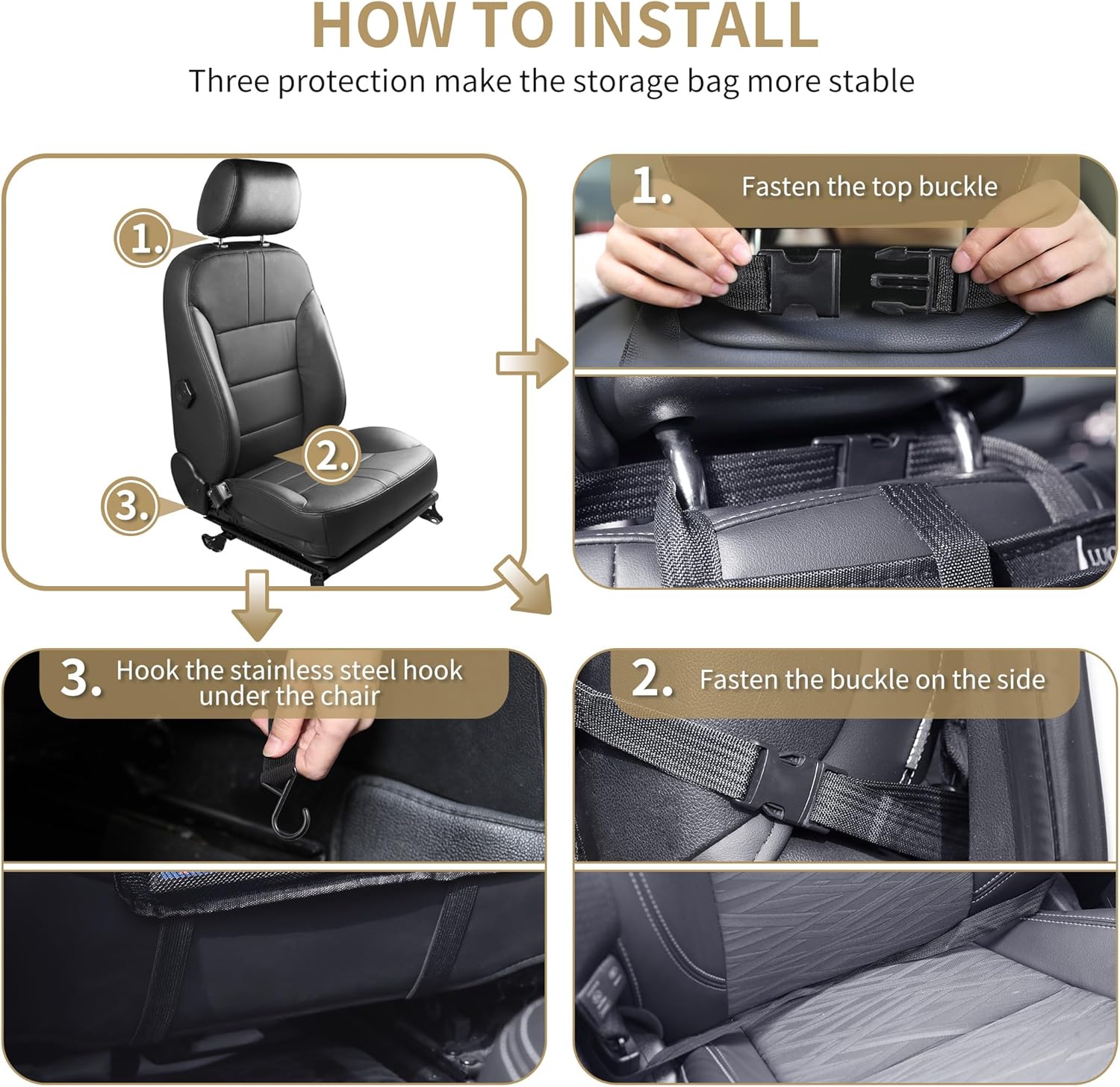 - 【Easy Installation】Adjustable buckle strap, plum buckles, aluminium hook plus strong straps ensures the great stability of the backseat organizer. The installation is pretty easy, only takes less than 5 minutes to finish.